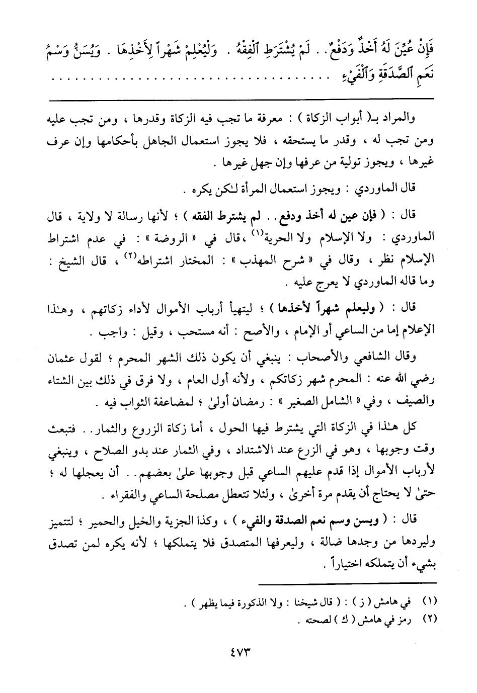 فَإِنْ عُيِّنَ لَهُ أَخْذٌ وَدَفْعٌ .. لَمْ يُشْتَرَطِ الْفِقْهُ. وَلْيُعْلِمْ شَهْرًا لِأَخْذِهَا. وَيُسَنُّ وَسْمُ نَعَمِ الصَّدَقَةِ وَالْفَيْءِ