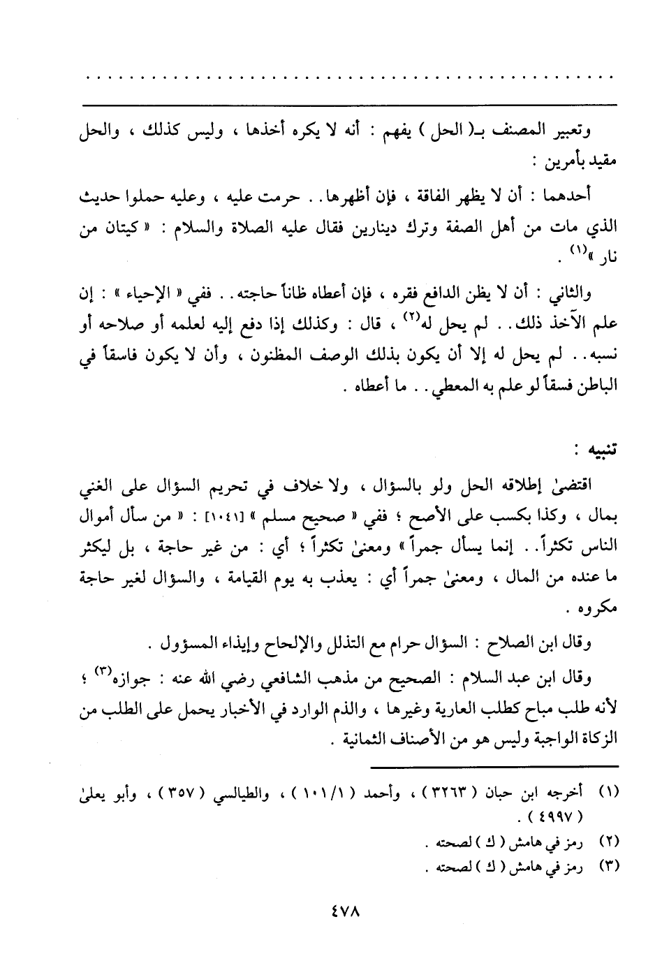 اقتضى إطلاقه الحل ولو بالسؤال، ولا خلاف في تحريم السؤال على الغني بمال، وكذا بكسب على الأصح؛ ففي (صحيح مسلم): (من سأل أموال الناس تكثرًا .. إنما يسأل جمرًا) ومعنى تكثرًا؛ أي: من غير حاجة، بل ليكثر ما عنده من المال، ومعنى جمرًا أي: يعذب به يوم القيامة، والسؤال لغير حاجة مكروه.