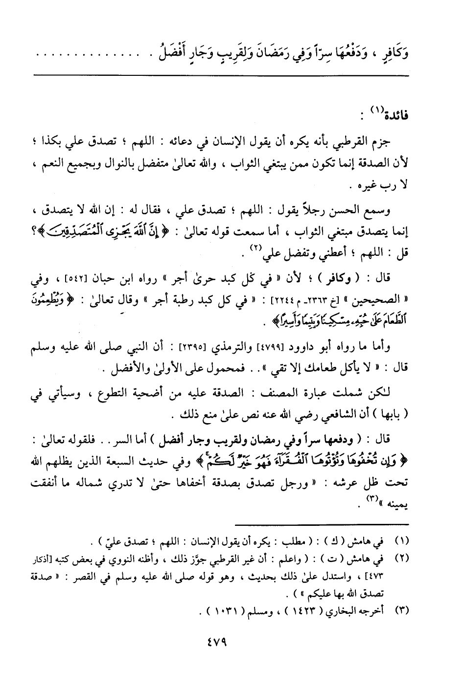 قال: (ودفعها سرًا وفي رمضان ولقريب وجار أفضل) أما السر .. فلقوله تعالى: {وَإِنْ تُخْفُوهَا وَتُؤْتُوهَا الْفُقَرَاءَ فَهُوَ خَيْرٌ لَكُمْ} وفي حديث السبعة الذين يظلهم الله تحت ظل عرشه: (ورجل تصدق بصدقة أخفاها حتى لا تدري شماله ما أنفقت يمينه).