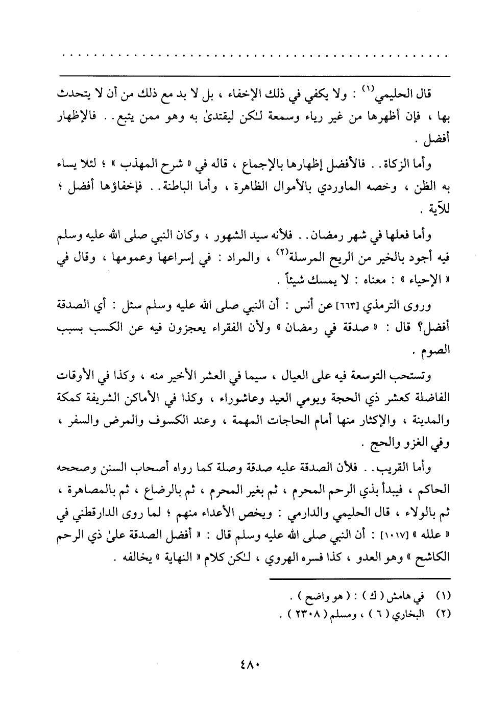 وأما الزكاة .. فالأفضل إظهارها بالإجماع، قاله في (شرح المهذب)؛ لئلا يساء به الظن، وخصه الماوردي بالأموال الظاهرة، وأما الباطنة .. فإخفاؤها أفضل؛ للآية.