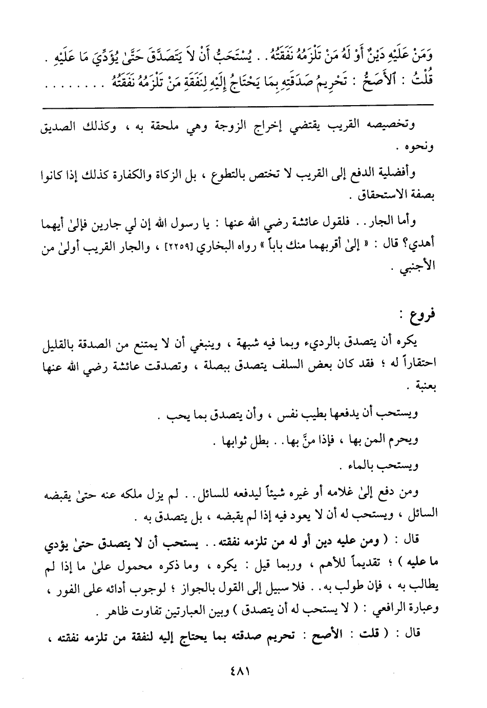 وَمَنْ عَلَيْهِ دَيْنٌ أَوْ لَهُ مَنْ تَلْزَمُهُ نَفَقَتُهُ .. يُسْتَحَبُّ أَنْ لاَ يَتَصَدَّقَ حَتَّى يُؤَدِّيَ مَا عَلَيْهِ. قُلْتُ: الأَصَحُّ: تَحْرِيمُ صَدَقَتِهِ بِمَا يَحْتَاجُ إِلَيْهِ لِنَفَقَةِ مَنْ تَلْزَمُهُ نَفَقَتُهُ