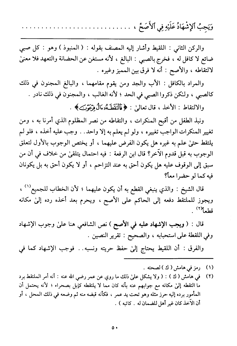 ونبذ الطفل من أقبح المنكرات، والتقاطه من نصر المظلوم الذي أمرنا به، ومن تغيير المنكرات الواجب تغييره، ولو لم يعلم به إلا واحد .. وجب عليه أخذه، فلو لم يلتقط حتى علم به غيره هل يكون الفرض عليهما، أو يختص الوجوب بالأول لتعلق الوجوب به قبل قدوم الآخر؟ قال ابن الرفعة: فيه احتمال يتلقى من خلاف في أن من سبق إلى الوقوف عليه هل يكون أحق به عند التزاحم، أو لا يكون أحق به بل يكونان فيه كما لو حضرا معًا؟