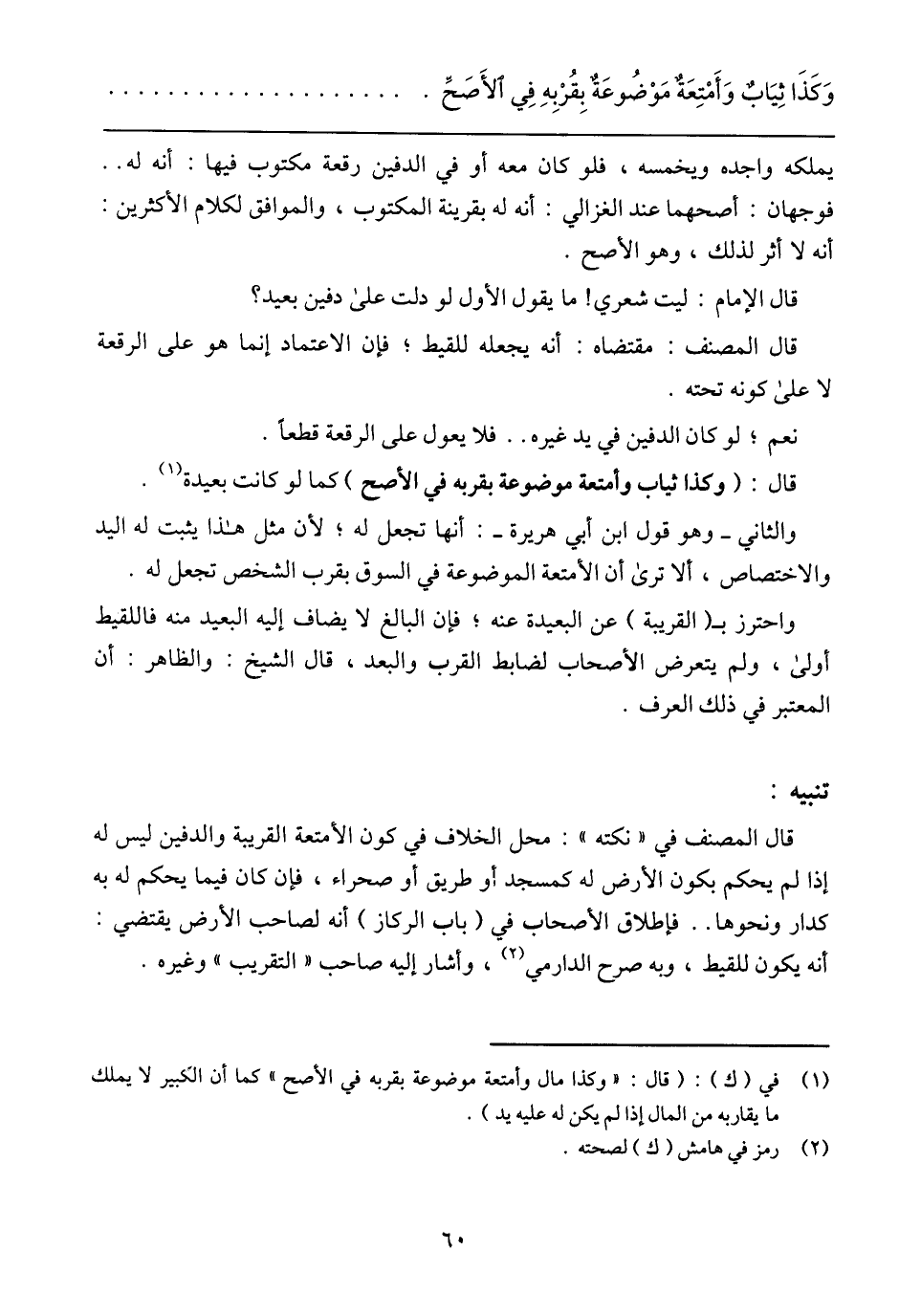 قال المصنف في (نكته): محل الخلاف في كون الأمتعة القريبة والدفين ليس له إذا لم يحكم بكون الأرض له كمسجد أو طريق أو صحراء، فإن كان فيما يحكم له به كدار ونحوها .. فإطلاق الأصحاب في (باب الركاز) أنه لصاحب الأرض يقتضي: أنه يكون للقيط، وبه صرح الدارمي، وأشار إليه صاحب (التقريب) وغيره.