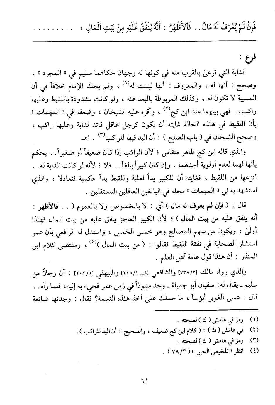 الدابة التي ترعى بالقرب منه في كونها له وجهان حكاهما سليم في (المجرد)، وصحح: أنها له، والمعروف: أنها ليست له، ولم يحك الإمام خلافًا في أن المسيبة لا تكون له، وكذلك المربوطة بالبعد عنه، ولو كانت مشدودة باللقيط وعليها راكب .. فهي بينهما عند ابن كج، وأقره عليه الشيخان، وضعفه في (المهمات) بأن اللقيط في هذه الحالة غايته أن يكون كرجل عاقل قائد لدابة وعليها راكب، وصحح الشيخان في (باب الصلح): أن اليد فيها للراكب. اهـ