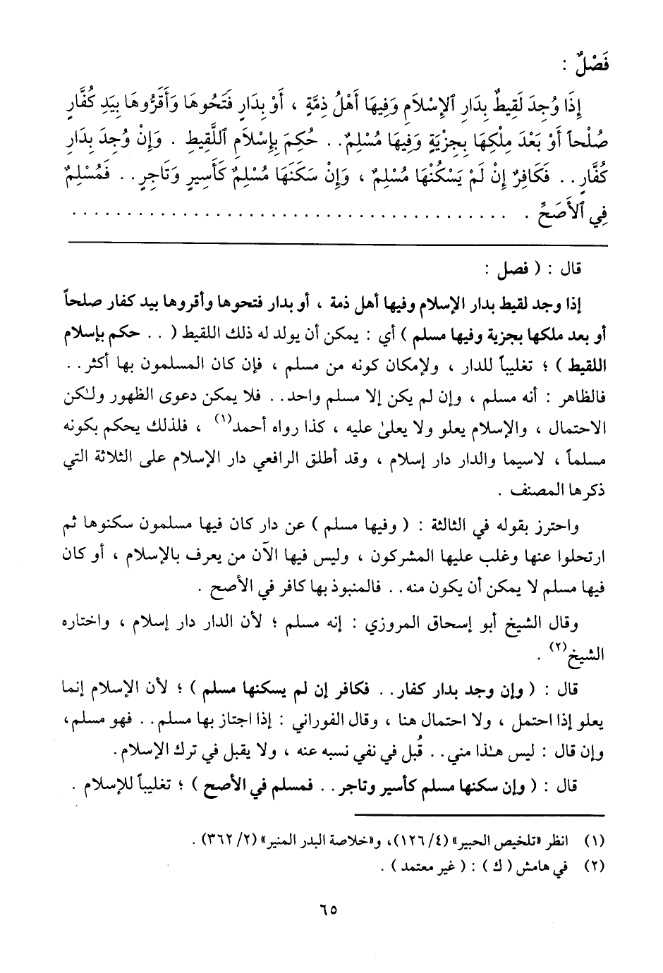 إِذَا وُجِدَ لَقِيطٌ بِدَارِ الْإِسْلَامِ وَفِيهَا أَهْلُ ذِمَّةٍ، أَوْ بِدَارٍ فَتَحُوهَا وَأَقَرُّوهَا بِيَدِ كُفَارٍ صُلْحاً أَوْ بَعْدَ مِلْكِهَا بِجِزْيَةٍ وَفِيهَا مُسْلِمٌ .. حُكِمَ بِإِسْلَامِ اللَّقِيطِ. وَإِنْ وُجِدَ بِدَارِ كُفَارٍ. فَكَافِرٌ إِنْ لمَ يَسْكُنْهَا مُسْلِمٌ، وَإِنْ سَكَنَهَا مُسْلِمٌ كَأَسِيرٍ وَتَاجِرٍ .. فَمُسْلِمٌ فِي الأَصَحِّ
