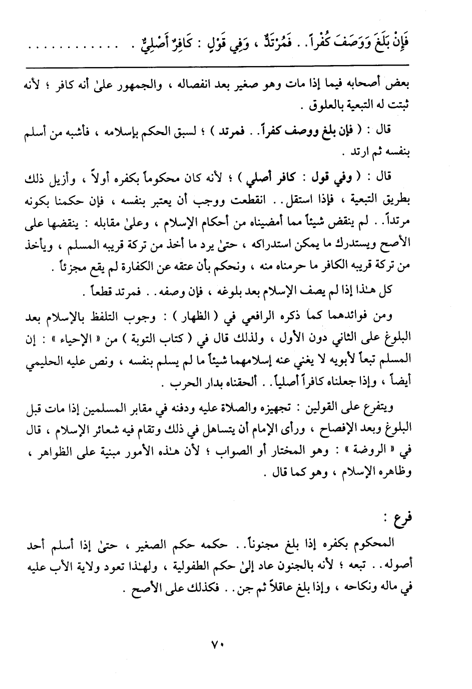 فَإِنْ بَلَغَ وَوَصَفَ كُفْرًا .. فَمُرْتَدٌ، وَفِي قَوْلٍ: كَافِرٌ أَصْلِيٌّ