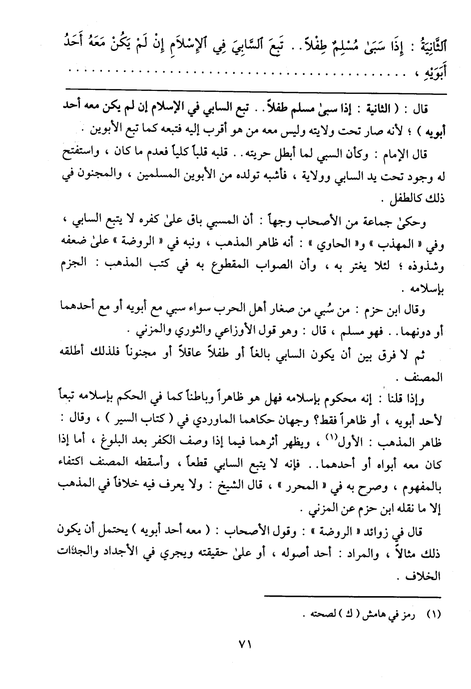 وحكى جماعة من الأصحاب وجهًا: أن المسبي باق على كفره لا يتبع السابي، وفي (المهذب) و (الحاوي): أنه ظاهر المذهب، ونبه في (الروضة) على ضعفه وشذوذه؛ لئلا يغتر به، وأن الصواب المقطوع به في كتب المذهب: الجزم بإسلامه.