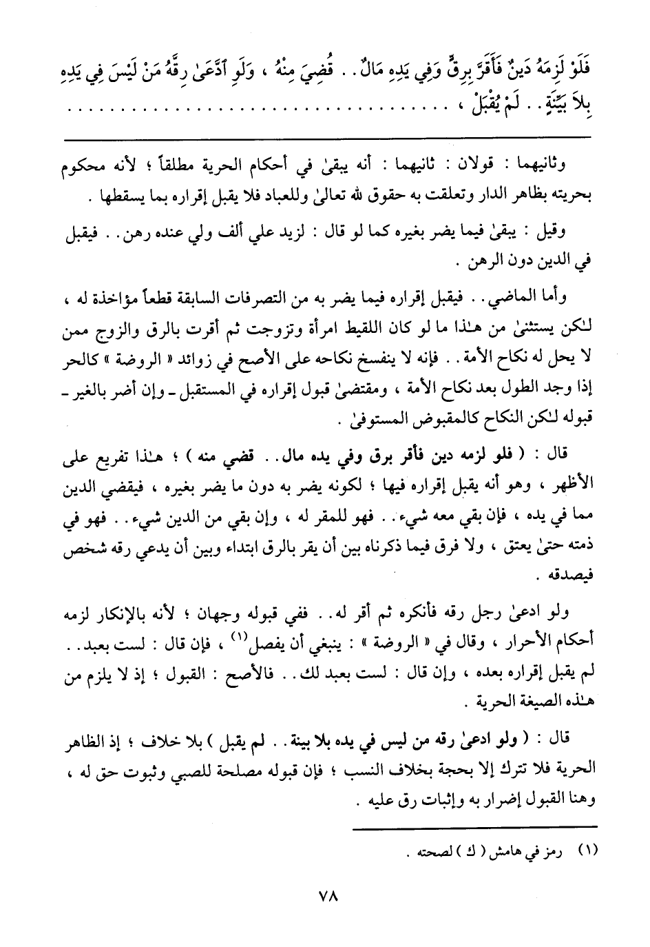 ولو ادعى رجل رقه فأنكره ثم أقر له .. ففي قبوله وجهان؛ لأنه بالإنكار لزمه أحكام الأحرار، وقال في (الروضة): ينبغي أن يفصل، فإن قال: لست بعبد .. لم يقبل إقراره بعده، وإن قال: لست بعبد لك .. فالأصح: القبول؛ إذ لا يلزم من هذه الصيغة الحرية.
