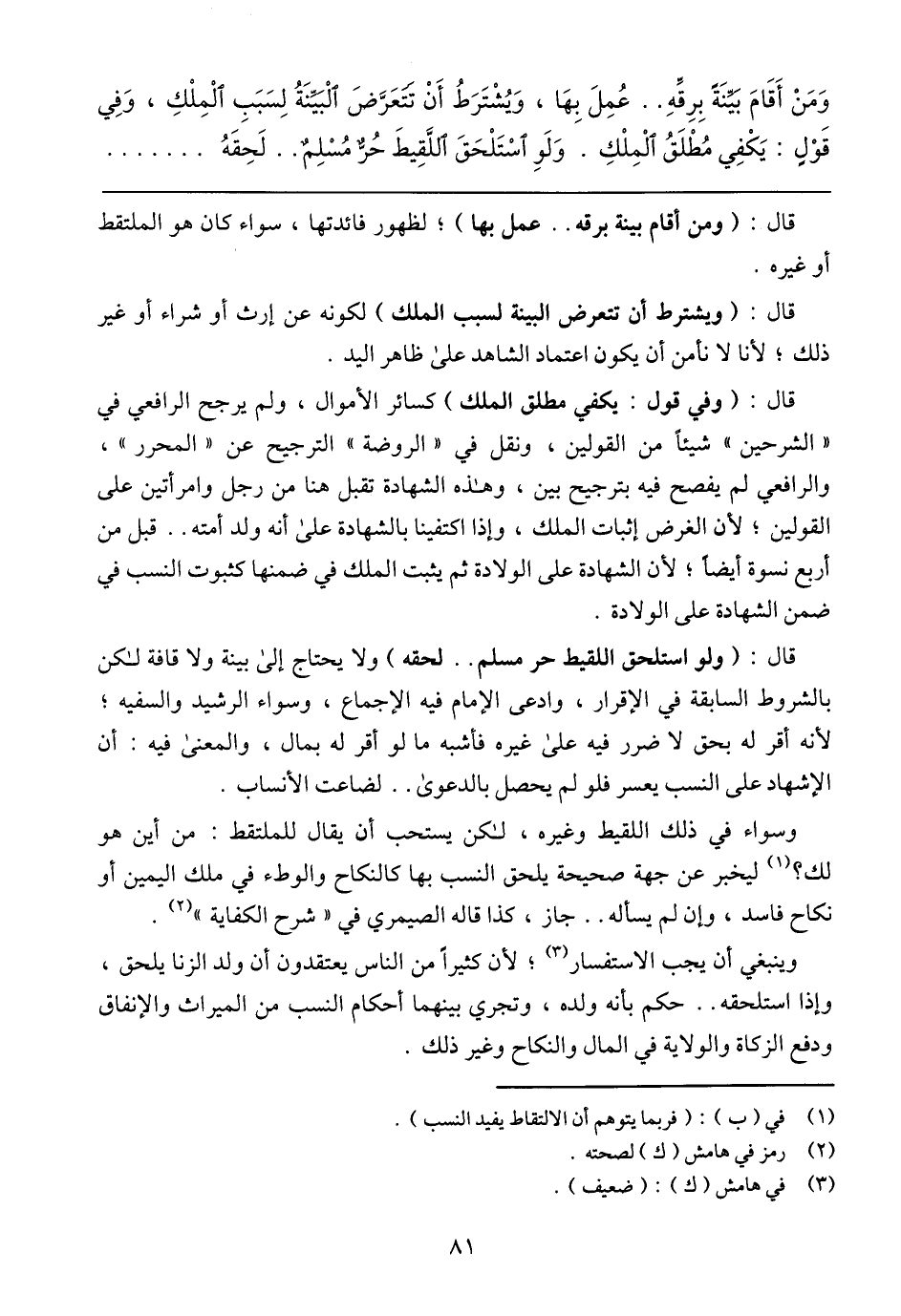 قال: (ولو استلحق اللقيط حر مسلم .. لحقه) ولا يحتاج إلى بينة ولا قافه لكن بالشروط السابقة في الإقرار، وادعى الإمام فيه الإجماع، وسواء الرشيد والسفيه؛ لأنه أقر له بحق لا ضرر فيه على غيره فأشبه ما لو أقر بمال، والمعنى فيه: أن الإشهاد على النسب يعسر فلو لم يحصل بالدعوى .. لضاعت الأنساب.
