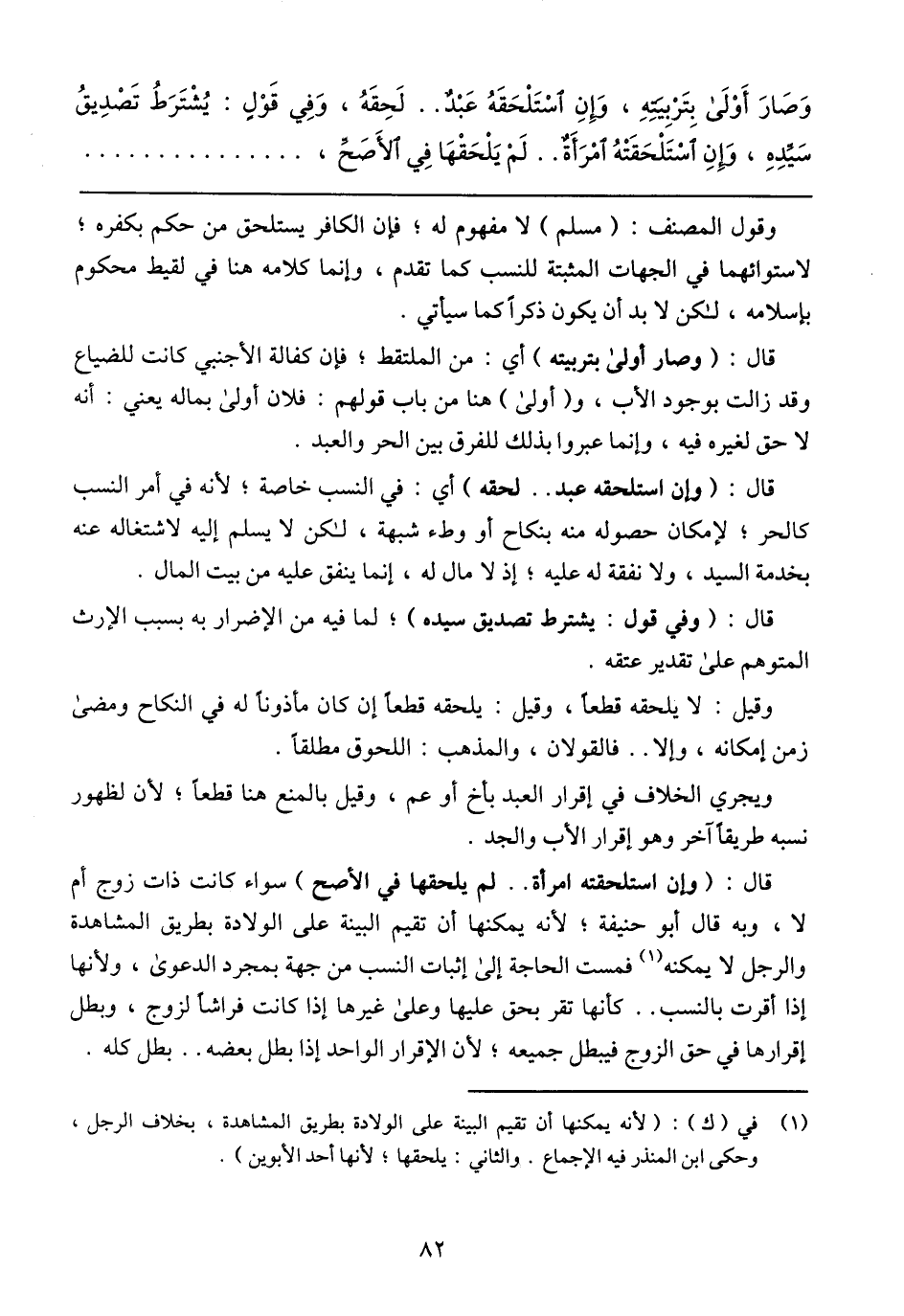 قال: (وإن استلحقه عبد .. لحقه) أي: في النسب خاصة؛ لأنه في أمر النسب كالحر؛ لإمكان حصوله منه بنكاح أو وطء شبهة، لكن لا يسلم إليه لاشتغاله عنه بخدمة السيد، ولا نفقة له عليه؛ إذ لا مال له، إنما ينفق عليه من بيت المال.