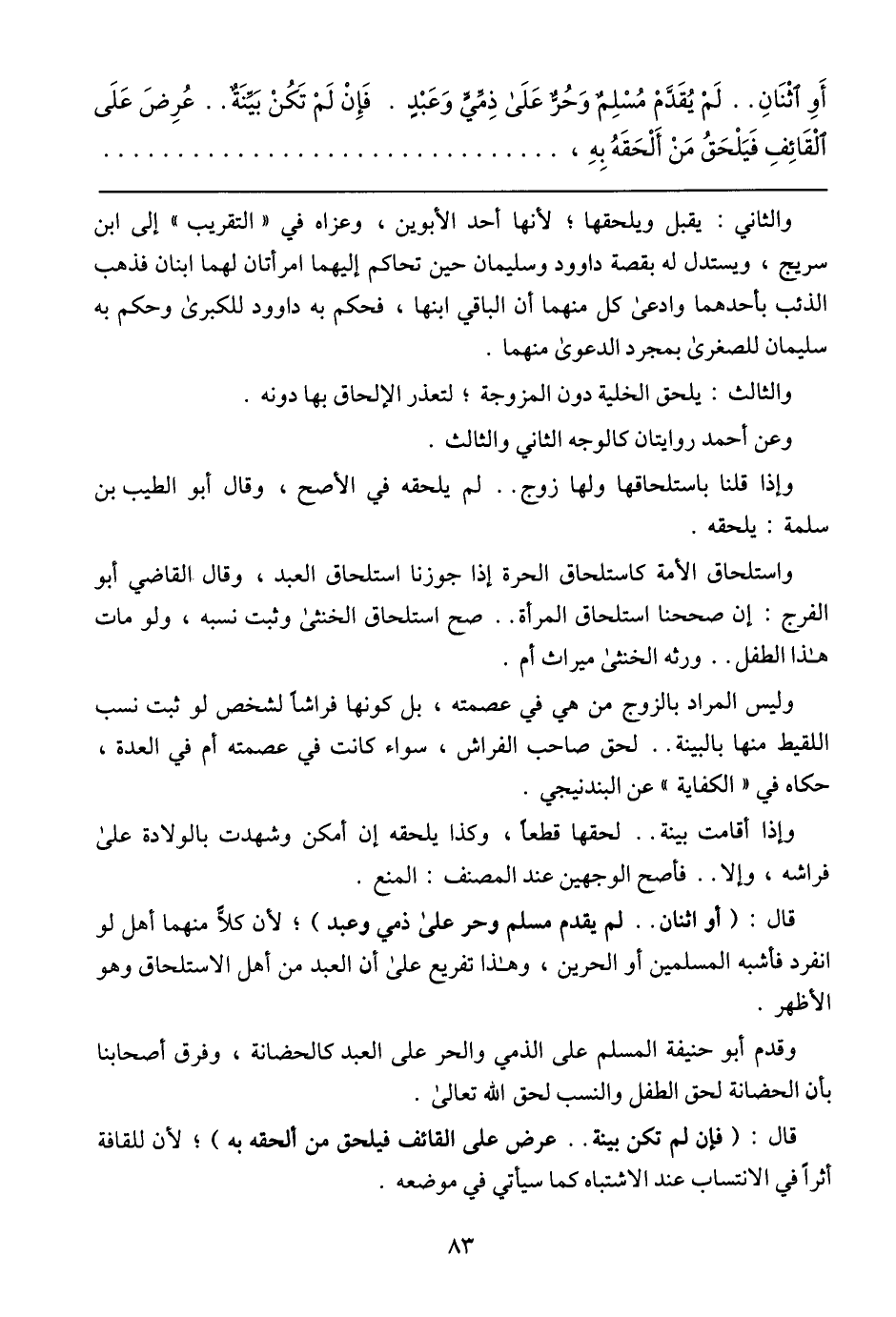 أَوْ اثْنَانِ .. لَمْ يُقَدَّمْ مُسْلِمٌ وَحُرٌّ عَلَى ذِمِّيٍّ وَعَبْدٍ. فَإِنْ لَمْ تَكُنْ بَيِّنَةٌ .. عُرِضَ عَلَى الْقَائِفِ فَيَلْحَقُ مَنْ أَلْحَقَهُ بِهِ،