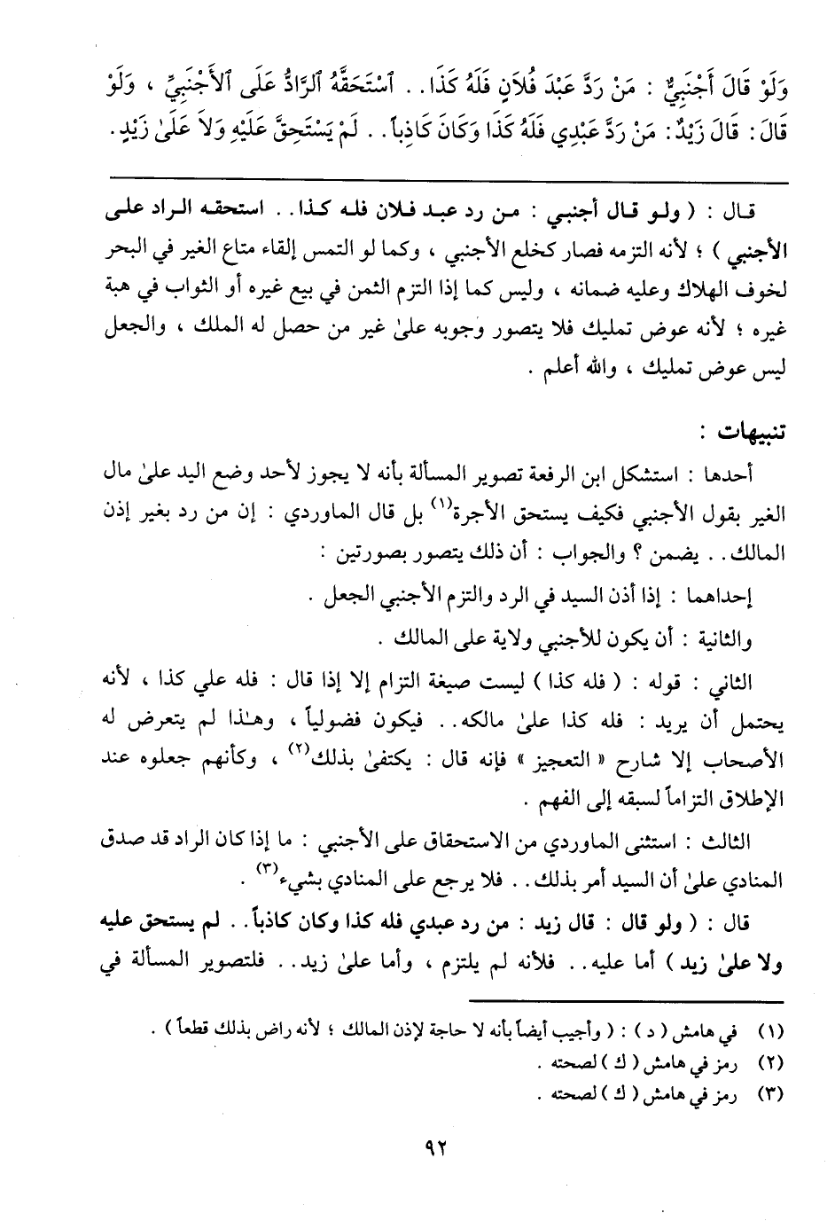الثالث: استثنى الماوردي من الاستحقاق على الأجنبي: ما إذا كان الراد قد صدق المنادي على أن السيد أمر بذلك .. فلا يرجع على المنادي بشيء.