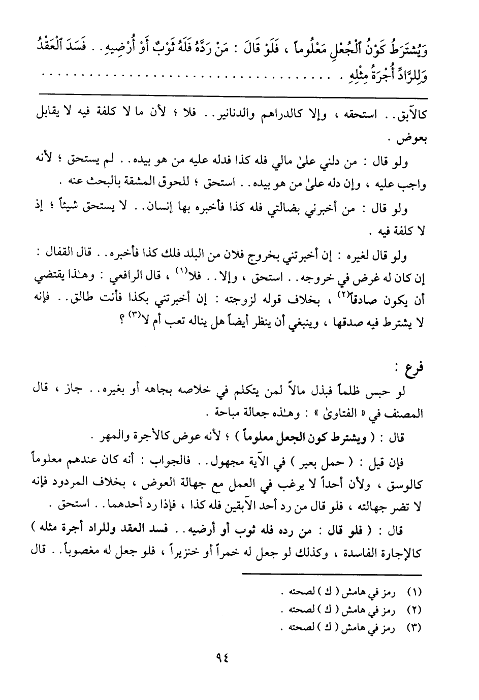 ولو قال: من دلني على مالي فله كذا فدله عليه من هو بيده .. لم يستحق؛ لأنه واجب عليه، وإن دله على من هو بيده .. استحق؛ للحوق المشقة بالبحث عنه.