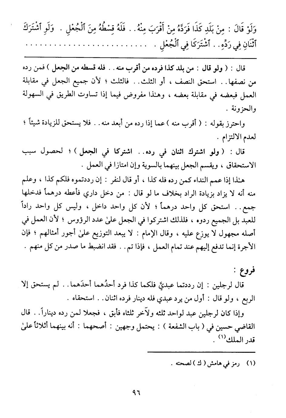 قال: (ولو قال: من بلد كذا فرده من أقرب منه .. فله قسطه من الجعل) فمن رده من نصفها .. استحق النصف، أو الثلث .. فالثلث؛ لأن جميع الجعل في مقابلة العمل فبعضه في مقابلة بعضه، وهذا مفروض فيما إذا تساوت الطريق في السهولة والحزونة.