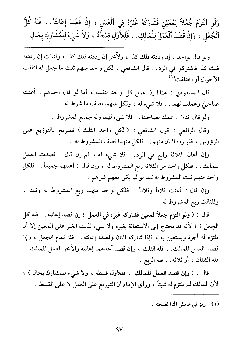 قال: (وإن قصد العمل للمالك .. فللأول قسطه، ولا شيء للمشارك بحال)؛ لأن المالك لم يتلزم له شيئًا، ورأى الإمام أن التوزيع على العمل لا على القسط.