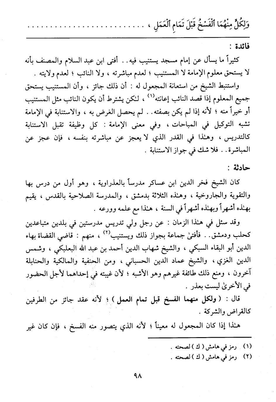 كثيرًا ما يسأل عن إمام مسجد يستنيب فيه .. أفتى ابن عبد السلام والمصنف بأنه لا يستحق معلوم الإمامة لا المستنيب؛ لعدم مباشرته، ولا النائب؛ لعدم ولايته.