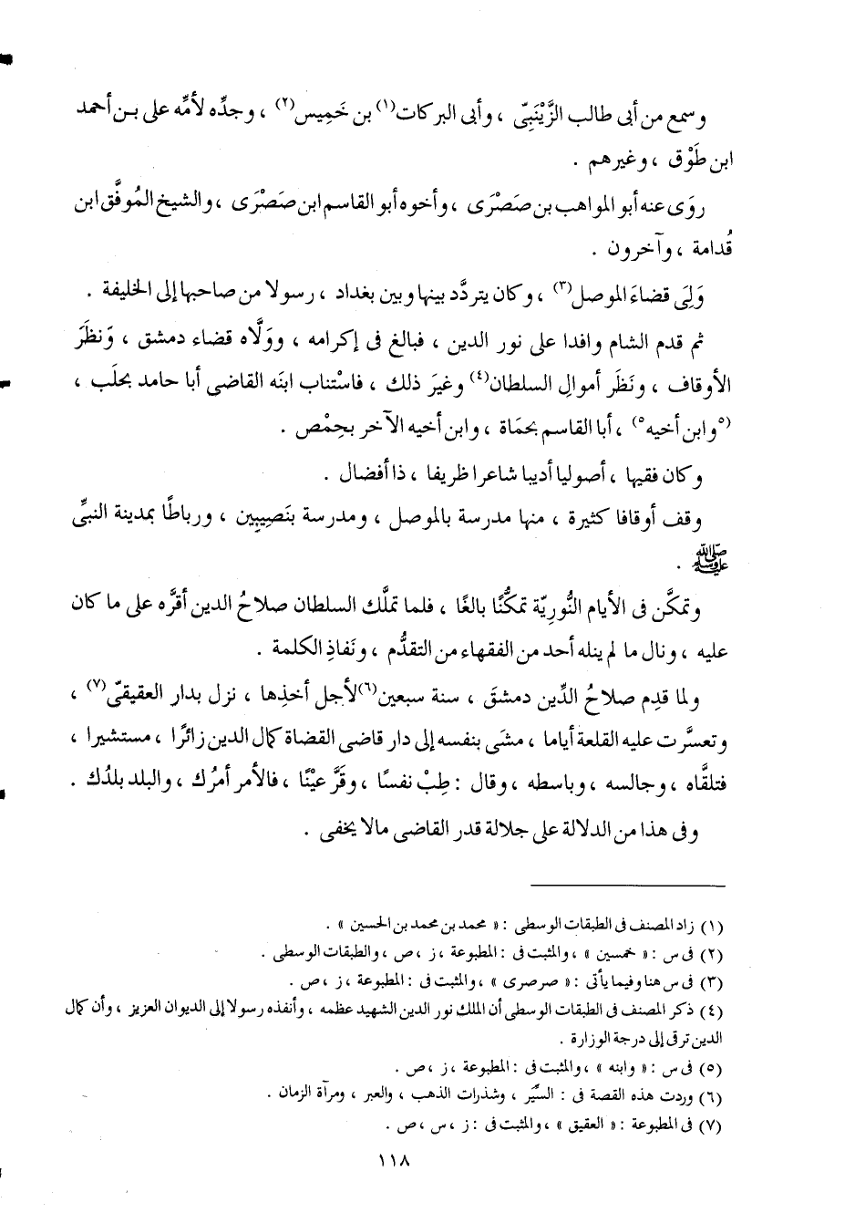 وَلما قدم صَلَاح الدّين دمشق سنة سبعين لأجل أَخذهَا نزل بدار العقيقي وتعسرت عَلَيْهِ القلعة أَيَّامًا مَشى بِنَفسِهِ إِلَى دَار قَاضِي الْقُضَاة كَمَال الدّين زَائِرًا مستشيرا فَتَلقاهُ وجالسه وباسطه وَقَالَ طب نفسا وقر عينا فَالْأَمْر أَمرك والبلد بلدك