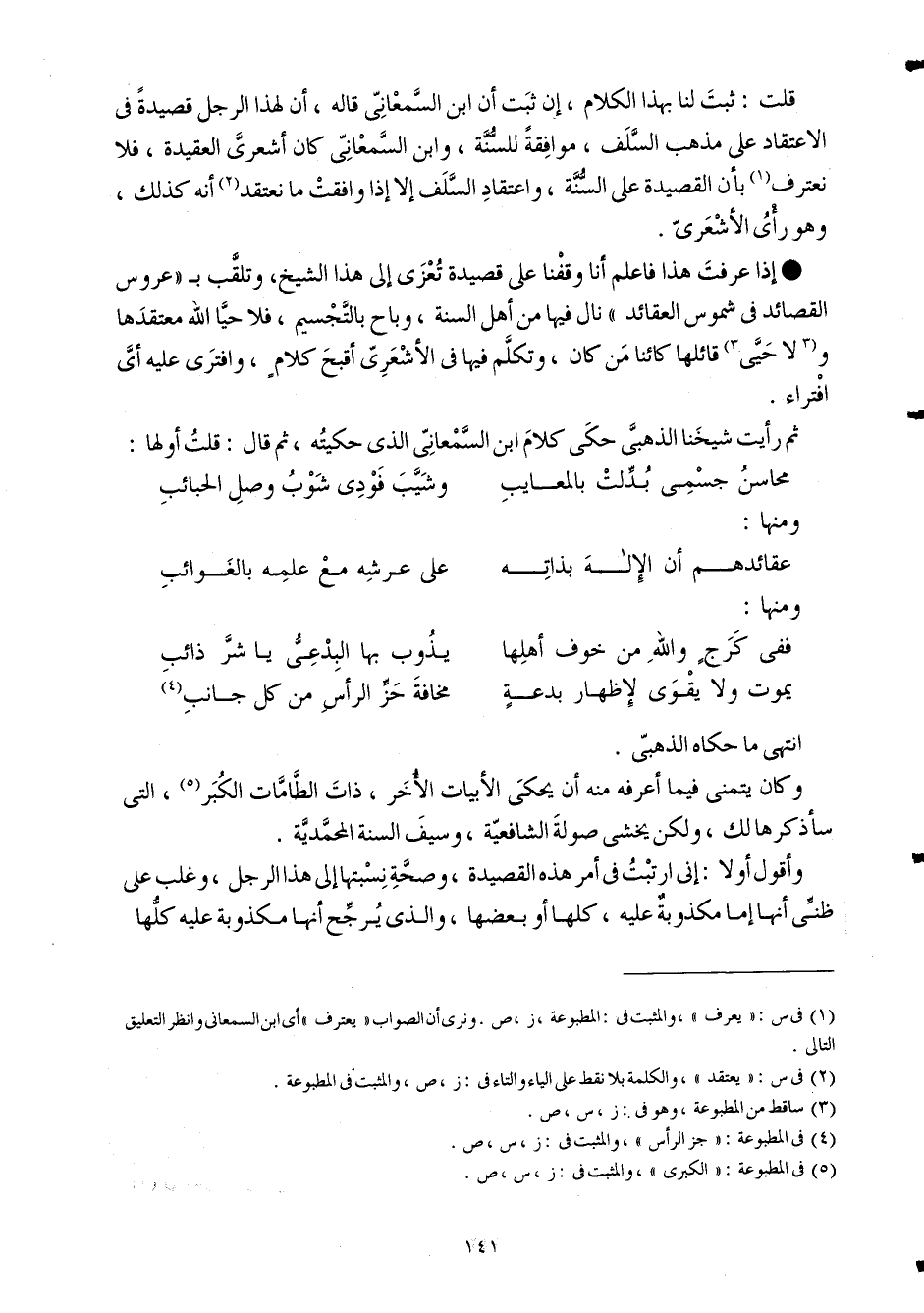 قلت ثَبت لنا بِهَذَا الْكَلَام إِن ثَبت أَن ابْن السَّمْعَانِيّ قَالَه أَن لهَذَا الرجل قصيدة فِي الِاعْتِقَاد على مَذْهَب السّلف مُوَافقَة للسّنة وَابْن السَّمْعَانِيّ كَانَ أشعري العقيدة فَلَا نعترف بِأَن القصيدة على السّنة واعتقاد السّلف إِلَّا إِذا وَافَقت مَا نعتقد أَنه كَذَلِك وَهُوَ رأى الْأَشْعَرِيّ