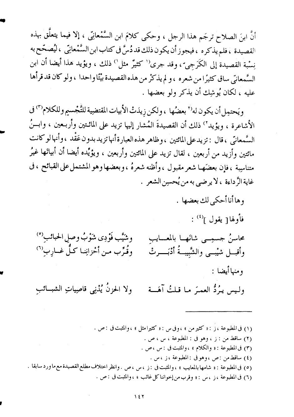 أَن ابْن الصّلاح ترْجم هَذَا الرجل وَحكى كَلَام ابْن السَّمْعَانِيّ إِلَّا فِيمَا يتَعَلَّق بِهَذِهِ القصيدة فَلم يذكرهُ فَيجوز أَن يكون ذَلِك قد دس فِي كتاب ابْن السَّمْعَانِيّ ليصحح بِهِ نِسْبَة القصيدة إِلَى الكرجي وَقد جرى كثير مثل ذَلِك وَيُؤَيّد هَذِه أَيْضا أَن ابْن السَّمْعَانِيّ سَاق كثيرا من شعره وَلم يذكر من هَذِه القصيدة بَيْتا وَاحِدًا وَلَو كَانَ قد قَرَأَهَا عَلَيْهِ لَكَانَ يُوشك أَن يذكر وَلَو بَعْضهَا