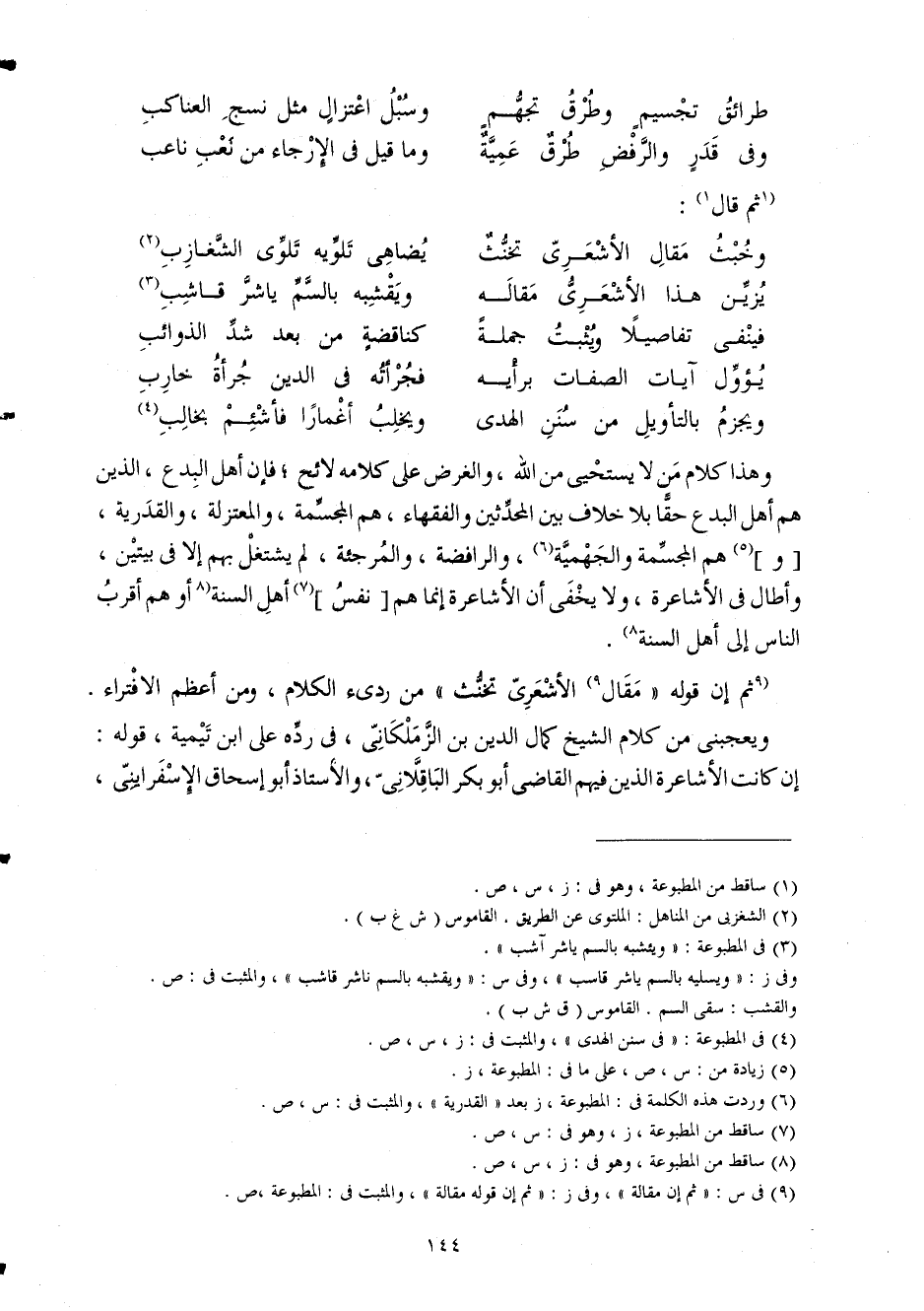 وَهَذَا كَلَام من لَا يستحيي من الله وَالْغَرَض على كَلَامه لائح فَإِن أهل الْبدع الَّذين هم أهل الْبدع حَقًا بِلَا خلاف بَين الْمُحدثين وَالْفُقَهَاء هم المجسمة والمعتزلة والقدرية وهم المجسمة والجهمية والرافضة والمرجئة لم يشْتَغل بهم إِلَّا فِي بَيْتَيْنِ وَأطَال فِي الأشاعرة وَلَا يخفى أَن الأشاعرة إِنَّمَا هم نفس أهل السّنة أَو هم أقرب النَّاس إِلَى أهل السّنة