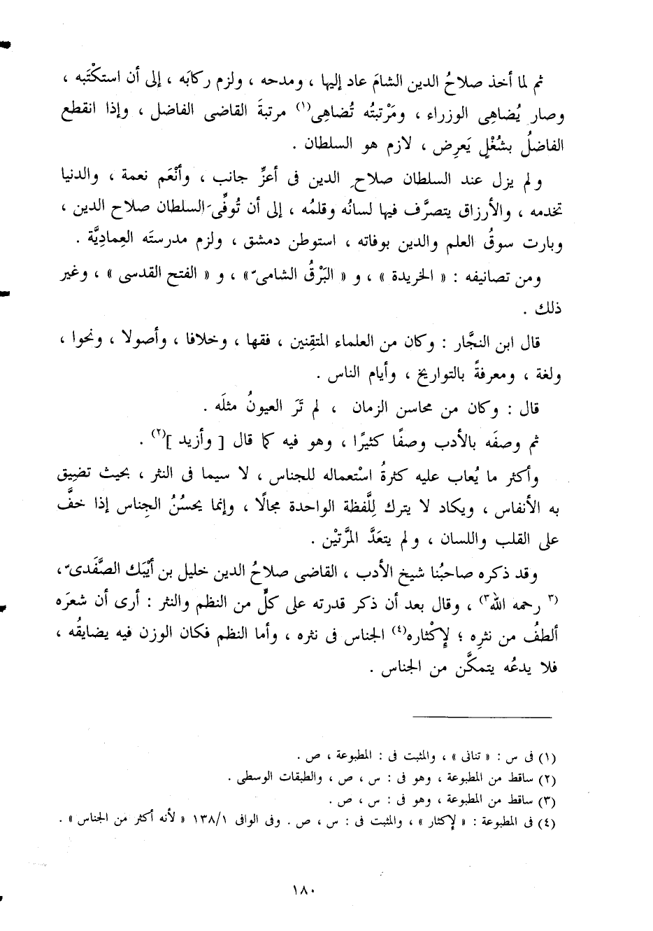وَقد ذكره صاحبنا شيخ الْأَدَب القَاضِي صَلَاح الدّين خَلِيل بن أَبِيك الصَّفَدِي رَحمَه الله وَقَالَ بعد أَن ذكر قدرته على كل من النّظم والنثر أرى أَن شعره ألطف من نثره لإكثار الجناس فِي نثره وَأما النّظم فَكَانَ الْوَزْن فِيهِ يضايقه فَلَا يَدعه يتَمَكَّن من الجناس