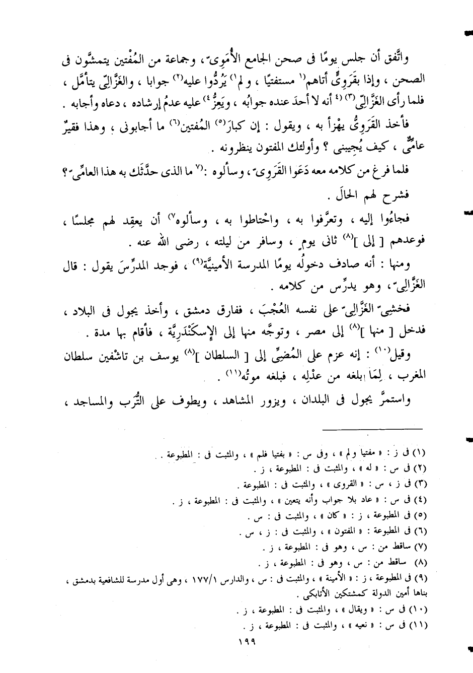 وَاتفقَ أَن جلس يَوْمًا فِي صحن الْجَامِع الْأمَوِي وَجَمَاعَة من الْمُفْتِينَ يتمشون فِي الصحن وَإِذا بقروي أَتَاهُم مستفتيا وَلم يردوا عَلَيْهِ جَوَابا وَالْغَزالِيّ يتَأَمَّل فَلَمَّا رأى الْغَزالِيّ أَنه لَا أحد عِنْده جَوَابه ويعز عَلَيْهِ عدم إرشاده دَعَاهُ وأجابه