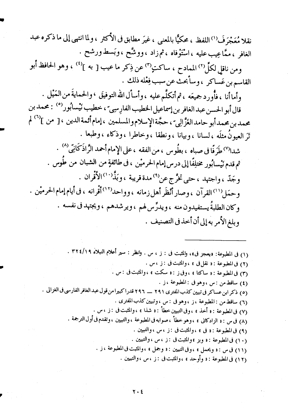 نقلا معجرف اللَّفْظ محكيا بِالْمَعْنَى غير مُطَابق فِي الْأَكْثَر وَلما انْتهى إِلَى مَا ذكره عبد الغافر مِمَّا عيب عَلَيْهِ اسْتَوْفَاهُ ثمَّ زَاد ووشح وَبسط وَرشح