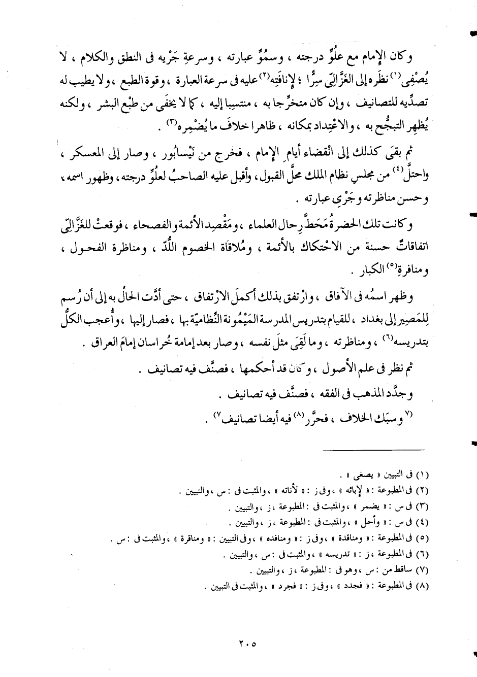 وَكَانَ الإِمَام مَعَ علو دَرَجَته وسمو عِبَارَته وَسُرْعَة جريه فِي النُّطْق وَالْكَلَام لَا يصفي نظره إِلَى الْغَزالِيّ سرا لإنافته عَلَيْهِ فِي سرعَة الْعبارَة وَقُوَّة الطَّبْع وَلَا يطيب لَهُ تصدية للتصانيف وَإِن كَانَ متخرجا بِهِ منتسبا إِلَيْهِ كَمَا لَا يخفى من طبع الْبشر وَلكنه يظْهر التبجح بِهِ والاعتداد بمكانه ظَاهرا خلاف مَا يضمره