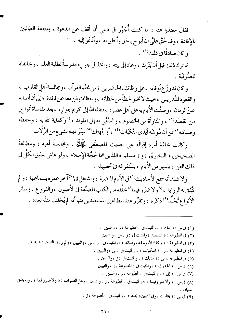 وَكَانَت خَاتِمَة أمره إقباله على حَدِيث الْمُصْطَفى صلى الله عَلَيْهِ وَسلم ومجالسة أَهله ومطالعة الصَّحِيحَيْنِ البُخَارِيّ وَمُسلم اللَّذين هما حجَّة الْإِسْلَام وَلَو عَاشَ لسبق الْكل فِي ذَلِك الْفَنّ بِيَسِير من الْأَيَّام يستفرغه فِي تَحْصِيله