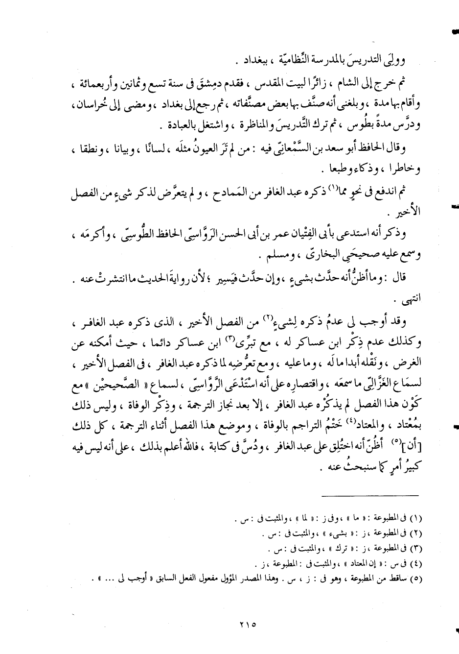 وَقد أوجب لي عدم ذكره لشَيْء من الْفَصْل الْأَخير الَّذِي ذكره عبد الغافر وَكَذَلِكَ عدم ذكر ابْن عَسَاكِر لَهُ مَعَ تبري ابْن عَسَاكِر دَائِما حَيْثُ أمكنه عَن الْغَرَض وَنَقله أبدا مَاله وَمَا عَلَيْهِ وَمَعَ تعرضه لما ذكره عبد الغافر فِي الْفَصْل الْأَخير لسَمَاع الْغَزالِيّ مَا اسْمَعْهُ واقتصاره على أَنه استدعى الرواسِي لسَمَاع الصَّحِيحَيْنِ مَعَ كَون هَذَا الْفَصْل لم يذكرهُ عبد الغافر إِلَّا بعد نجاز التَّرْجَمَة وَذكر الْوَفَاة وَلَيْسَ ذَلِك بمعتاد والمعتاد ختم التراجم بالوفاه وَمَوْضِع هَذَا الْفَصْل أثْنَاء التَّرْجَمَة كل ذَلِك أَن أَظن أَنه اختلق على عبد الغافر ودس فِي كِتَابه فَالله أعلم بذلك على أَنه لَيْسَ فِيهِ كَبِير أَمر كَمَا سنبحث عَنهُ