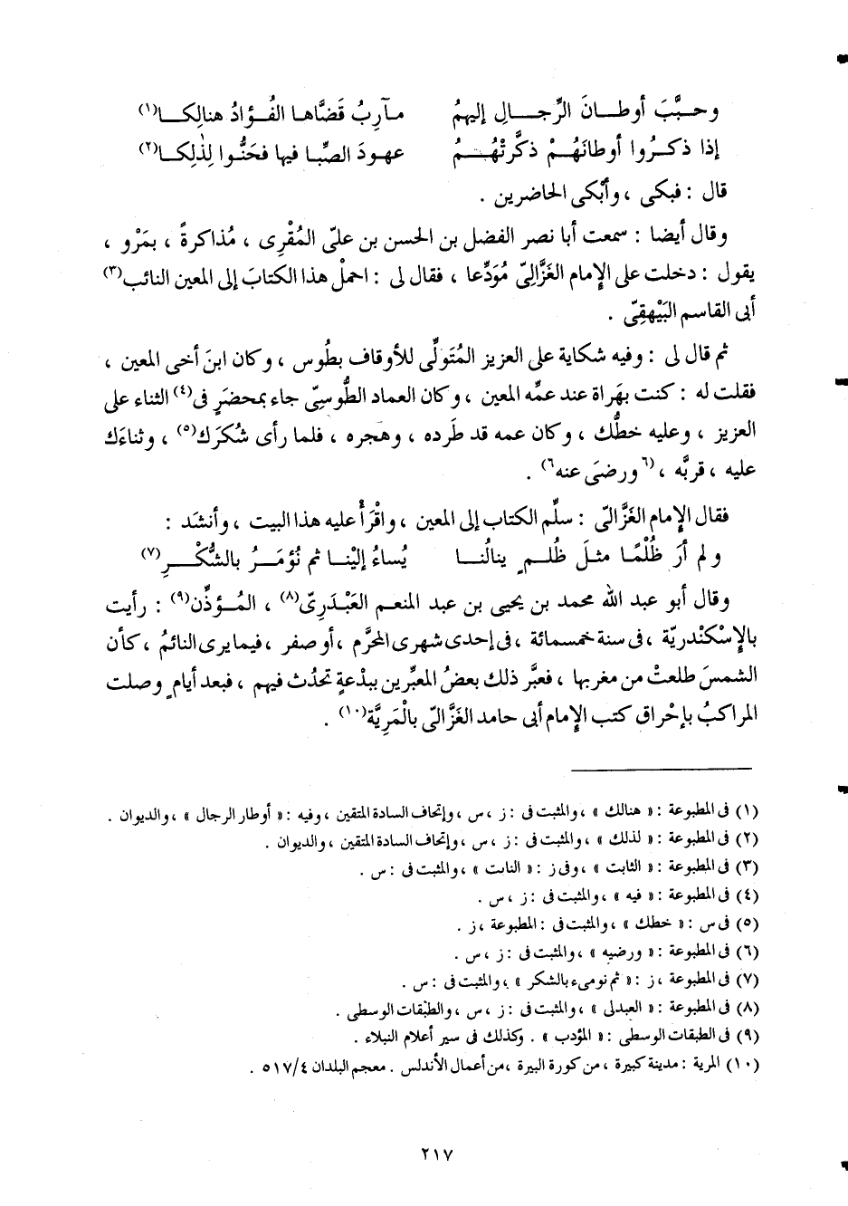 وَقَالَ أَيْضا سَمِعت أَبَا نصر الْفضل بن الْحسن بن عَليّ الْمقري مذاكرة بمرو يَقُول دخلت على الإِمَام الْغَزالِيّ مودعا فَقَالَ لي احْمِلْ هَذَا الْكتاب إِلَى الْمعِين النَّائِب أبي الْقَاسِم الْبَيْهَقِيّ