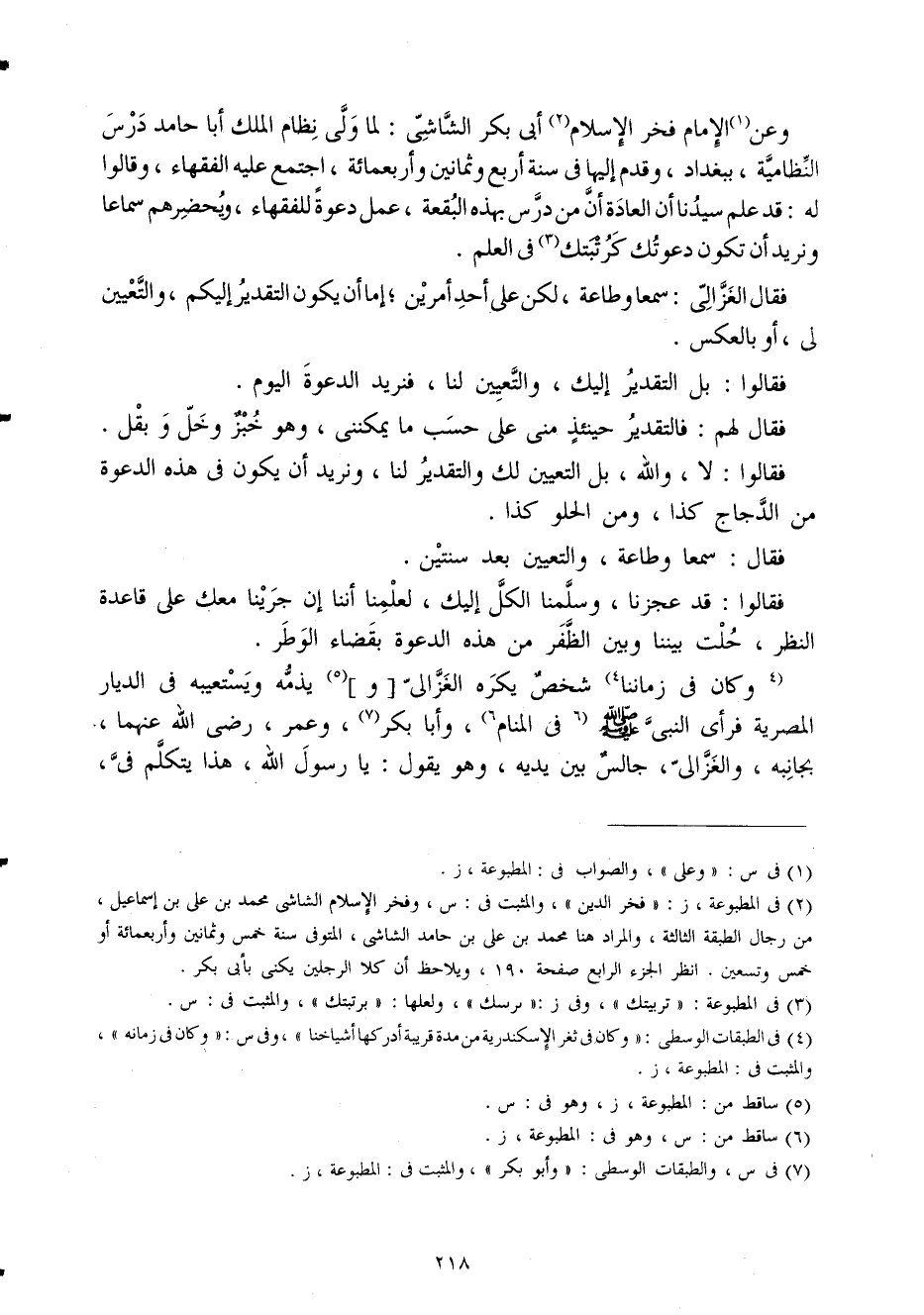 وَعَن الإِمَام فَخر الْإِسْلَام أبي بكر الشَّاشِي لما ولي نظام الْملك أَبَا حَامِد درس النظامية بِبَغْدَاد وَقدم إِلَيْهَا فِي سنة أَربع وَثَمَانِينَ وَأَرْبَعمِائَة اجْتمع عَلَيْهِ الْفُقَهَاء وَقَالُوا لَهُ قد علم سيدنَا أَن الْعَادة أَن من درس بِهَذِهِ الْبقْعَة عمل دَعْوَة للفقهاء ويحضرهم سَمَاعا ونريد أَن تكون دعوتك كرتبتك فِي الْعلم