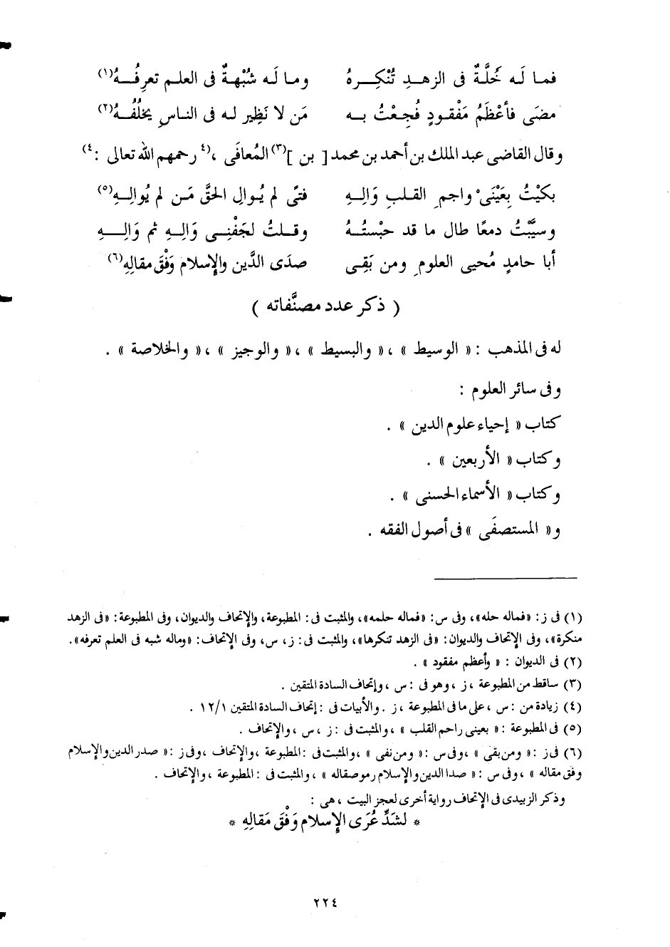(أَبَا حَامِد مُحي الْعُلُوم وَمن بَقِي ... صدى الدّين وَالْإِسْلَام وفْق مقاله)