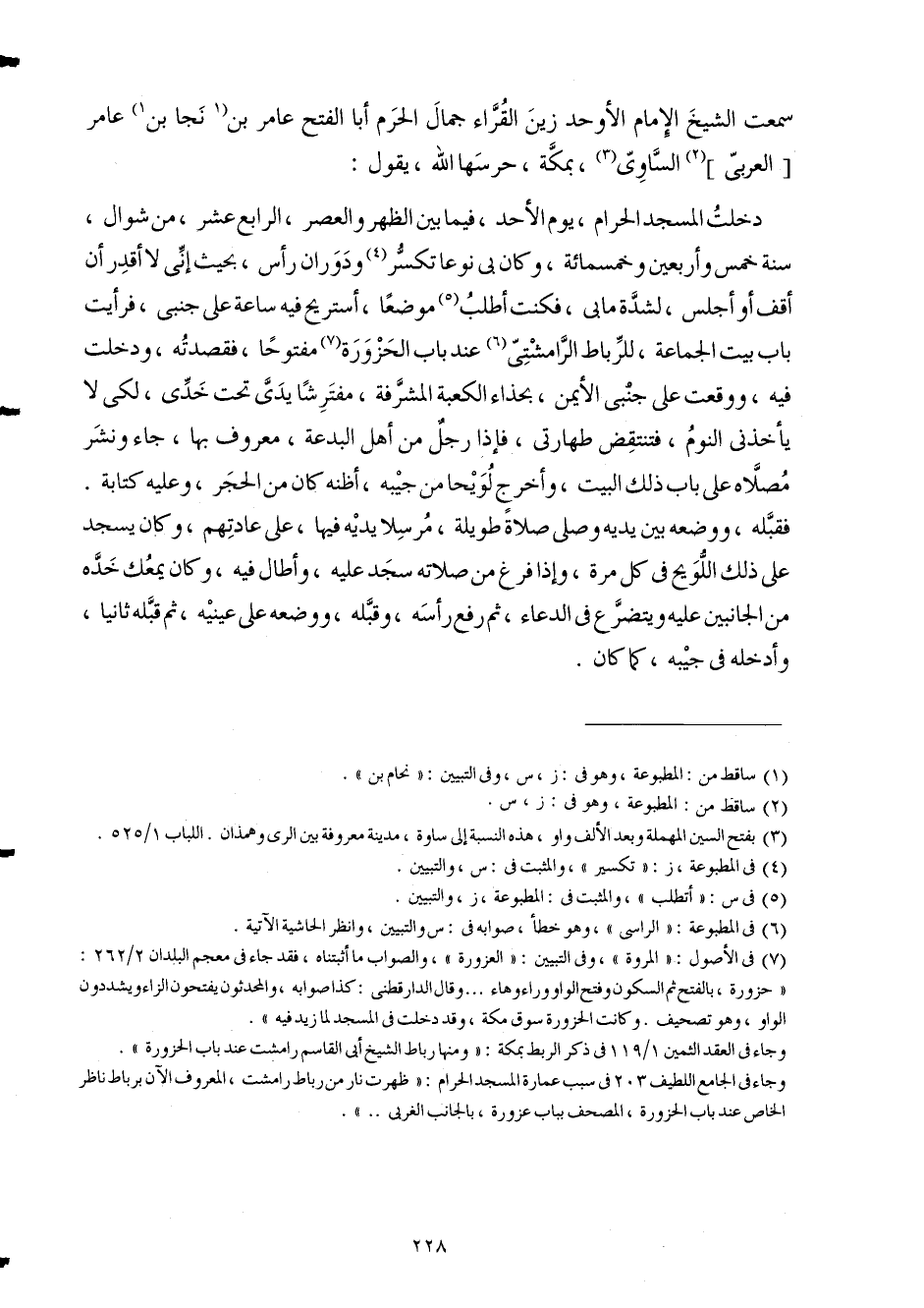سَمِعت الشَّيْخ الإِمَام الأوحد زين الْقُرَّاء جمال الْحرم أَبَا الْفَتْح عَامر بن نجا بن عَامر الْعَرَبِيّ الساوي بِمَكَّة حرسها الله يَقُول دخلت الْمَسْجِد الْحَرَام يَوْم الْأَحَد فِيمَا بَين الظّهْر وَالْعصر الرَّابِع عشر من شَوَّال سنة خمس وَأَرْبَعين وَخَمْسمِائة وَكَانَ بِي نوعا تكسر ودوران رَأس بِحَيْثُ أَنِّي لَا أقدر أَن أَقف أوأجلس لشدَّة مَا بِي فَكنت أطلب موضعا أستريح فِيهِ سَاعَة على جَنْبي فَرَأَيْت بَاب بَيت الْجَمَاعَة للرباط الرامشتي عِنْد بَاب الْحَزْوَرَة مَفْتُوحًا فقصدته وَدخلت فِيهِ وَوَقعت على جَنْبي الْأَيْمن بحذاء الْكَعْبَة المشرفة مفترشا يَدي تَحت خدي لكَي لَا يأخذني النّوم فتنتقض طهارتي فَإِذا رجل من أهل الْبِدْعَة مَعْرُوف بهَا جَاءَ وَنشر مُصَلَّاهُ على بَاب ذَلِك الْبَيْت وَأخرج لويحا من جيبه أَظُنهُ كَانَ من الْحجر وَعَلِيهِ كِتَابَة