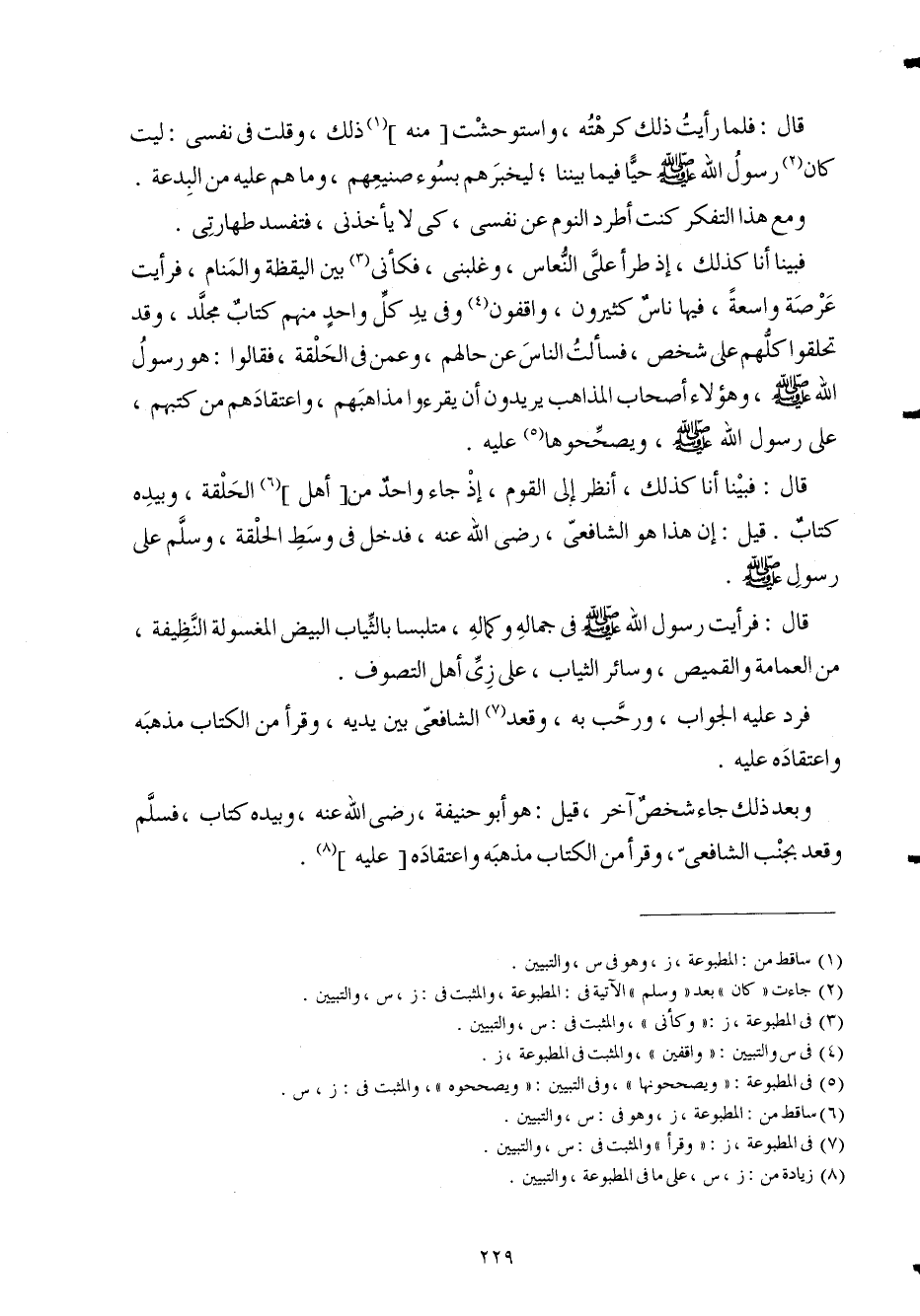 فَبينا أَنا كَذَلِك إِذْ طَرَأَ عَليّ النعاس وغلبني فَكَأَنِّي بَين الْيَقَظَة والمنام فَرَأَيْت عَرصَة وَاسِعَة فِيهَا نَاس كَثِيرُونَ واقفون وَفِي يَد كل وَاحِد مِنْهُم كتاب مُجَلد وَقد تحلقوا كلهم على شخص فَسَأَلت النَّاس عَن حَالهم وَعَمن فِي الْحلقَة فَقَالُوا هُوَ رَسُول الله صلى الله عَلَيْهِ وَسلم وَهَؤُلَاء أَصْحَاب الْمذَاهب يُرِيدُونَ أَن يقرءوا مذاهبهم واعتقادهم من كتبهمْ على رَسُول الله صلى الله عَلَيْهِ وَسلم ويصححوها عَلَيْهِ
