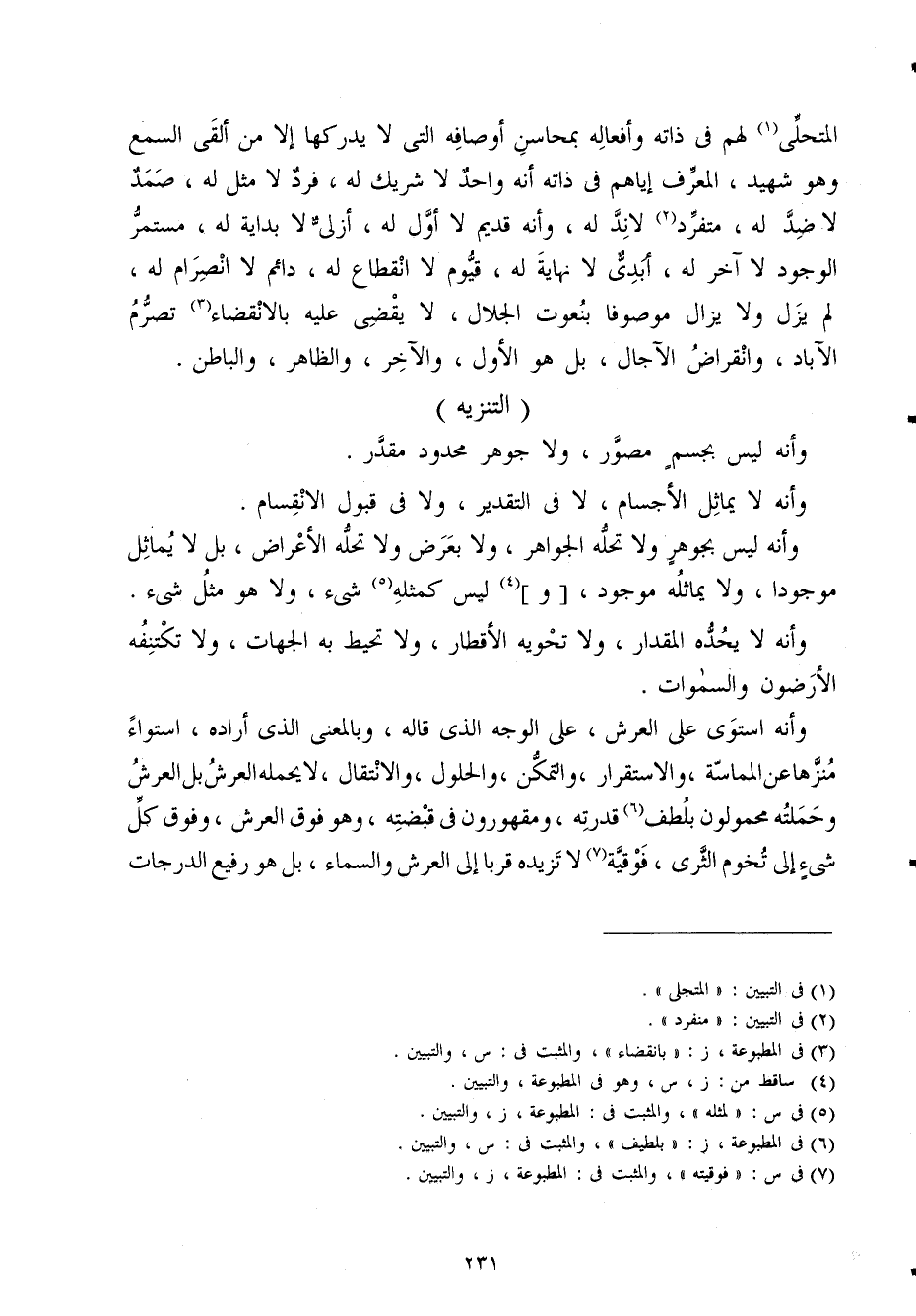 المتحلى لَهُم فِي ذَاته وأفعاله بمحاسن أَوْصَافه الَّتِي لَا يُدْرِكهَا إِلَّا من ألقِي السّمع وَهُوَ شَهِيد الْمُعَرّف إيَّاهُم فِي ذَاته أَنه وَاحِد لَا شريك لَهُ فَرد لامثل لَهُ صَمد لَا ضد لَهُ متفرد لاند لَهُ وَأَنه قديم لَا أول لَهُ أزلي لَا بداية لَهُ مُسْتَمر الْوُجُود لَا آخر لَهُ أبدي لَا نِهَايَة لَهُ قيوم لَا انْقِطَاع لَهُ دَائِم لَا انصرام لَهُ لم يزل وَلَا يزَال مَوْصُوفا بنعوت الْجلَال لَا يقْضى عَلَيْهِ بالانقضاء تصرم الآباد وانقراض الْآجَال بل هُوَ الأول وَالْآخر وَالظَّاهِر وَالْبَاطِن