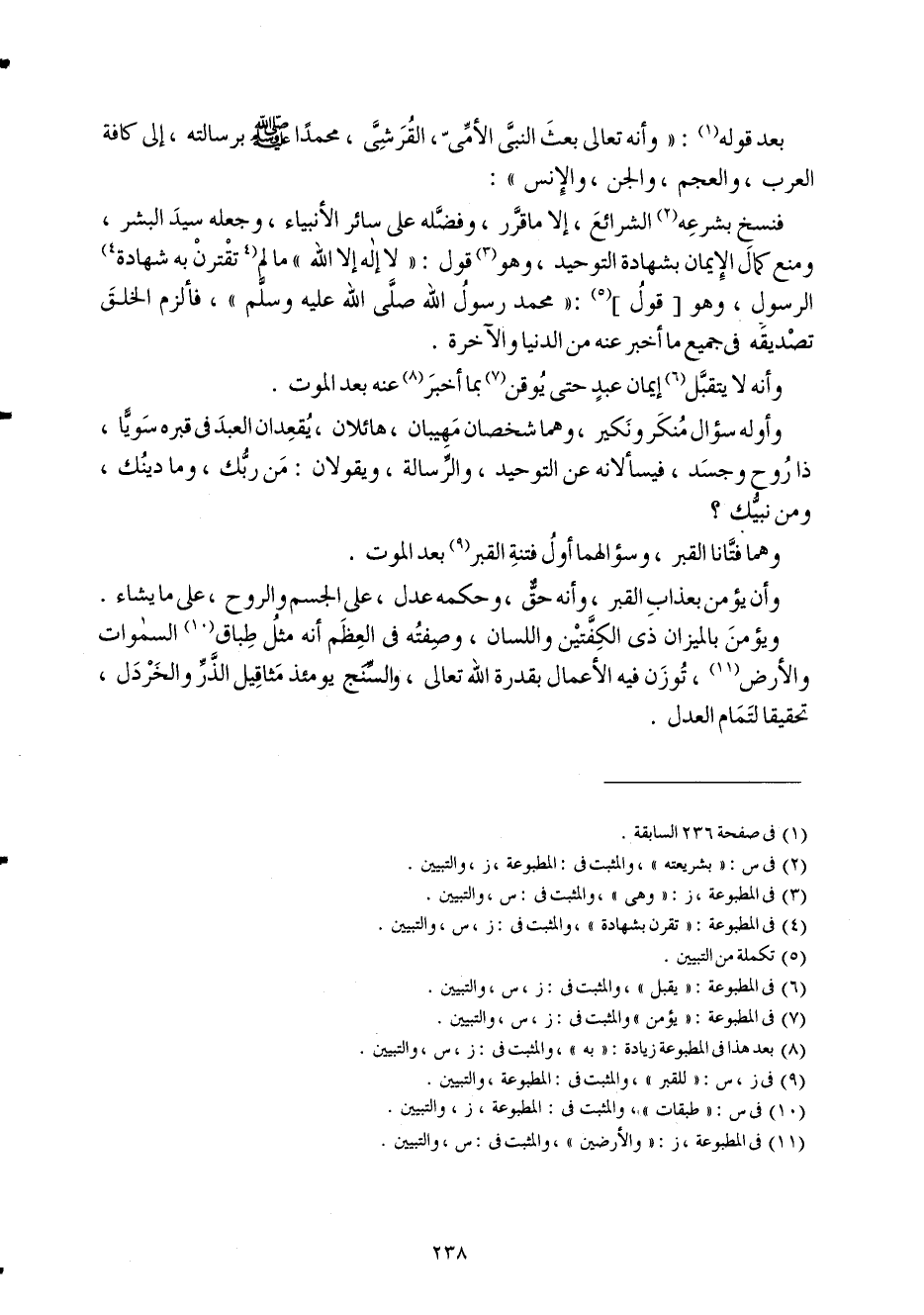 فنسخ بشرعة الشَّرَائِع إِلَّا ماقرر وفضله على سَائِر الْأَنْبِيَاء وَجعله سيد الْبشر وَمنع كَمَال الْإِيمَان بِشَهَادَة التَّوْحِيد وَهُوَ قَول لَا إِلَه إِلَّا الله مَا لم تقترن بِهِ شَهَادَة الرَّسُول وَهُوَ قَول مُحَمَّد رَسُول الله صلى الله عَلَيْهِ وَسلم فألزم الْخلق تَصْدِيقه فِي جَمِيع مَا أخبر عَنهُ من الدُّنْيَا وَالْآخِرَة