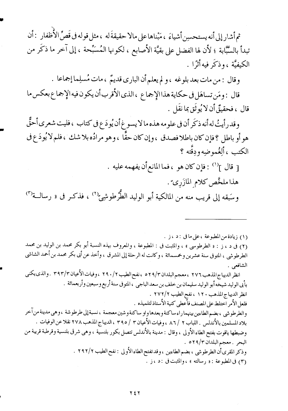 وَسَبقه إِلَى قريب مِنْهُ من الْمَالِكِيَّة أَبُو الْوَلِيد الطرطوشي فَذكر فِي رِسَالَة