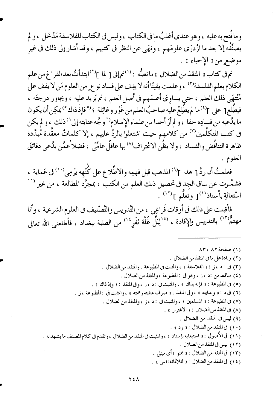 ثمَّ فِي كتاب المنقذ من الضلال مَا نَصه ثمَّ إِنِّي لما ابتدأت بعد الْفَرَاغ من علم الْكَلَام بِعلم الفلسفة وَعلمت يَقِينا أَنه لَا يقف على فَسَاد نوع من الْعُلُوم من لَا يقف على مُنْتَهى ذَلِك الْعلم حَتَّى يُسَاوِي أعلمهم فِي أصل الْعلم ثمَّ يزِيد عَلَيْهِ ويجاوز دَرَجَته فَيطلع على مَا لم يطلع عَلَيْهِ صَاحب الْعلم من غور وغائلة فَإذْ ذَاك يُمكن أَن يكون مَا يَدعِيهِ من فَسَاده حَقًا وَلم أر أحدا من عُلَمَاء الْإِسْلَام وَجه عنايته إِلَى ذَلِك وَلم يكن فِي كتب الْمُتَكَلِّمين من كَلَامهم حَيْثُ اشتغلوا بِالرَّدِّ عَلَيْهِم إِلَّا كَلِمَات معقدة مبددة ظَاهِرَة النتاقض وَالْفساد وَلَا يظنّ الِاعْتِرَاف بهَا عَاقل عَامي فضلا عَمَّن يَدعِي دقائق الْعُلُوم