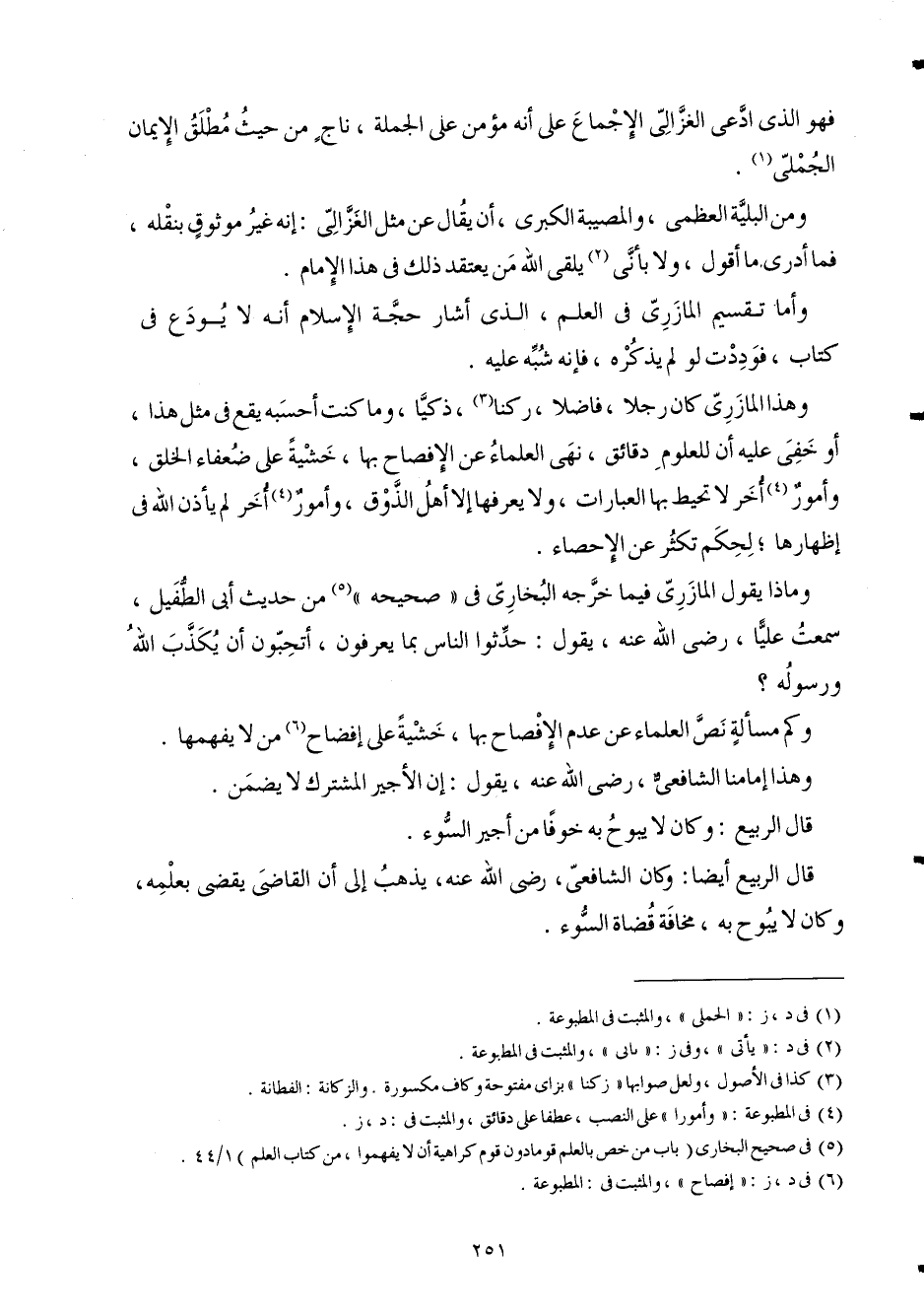 وَأما تَقْسِيم الْمَازرِيّ فِي الْعلم الَّذِي أَشَارَ حجَّة الْإِسْلَام أَنه لَا يودع فِي كتاب فوددت لَو لم يذكرهُ فَإِنَّهُ شبه عَلَيْهِ