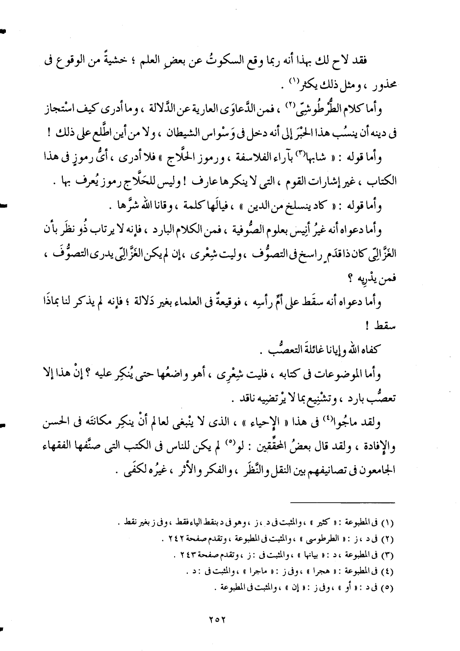 وَأما كَلَام الطرطوشي فَمن الدعاوي الْعَارِية عَن الْأَدِلَّة وَمَا أَدْرِي كَيفَ استجار فِي دينه أَن ينْسب هَذَا الحبر إِلَى أَنه دخل فِي وسواس الشَّيْطَان وَلَا من أَيْن أطلع على ذَلِك وَأما قَوْله شابها بآراء الفلاسفة ورموز الحلاج فَلَا أَدْرِي أَي رموز فِي هَذَا الْكتاب غير إشارات الْقَوْم الَّتِي لَا ينكرها عَارِف وَلَيْسَ للحلاج رموز يعرف بهَا