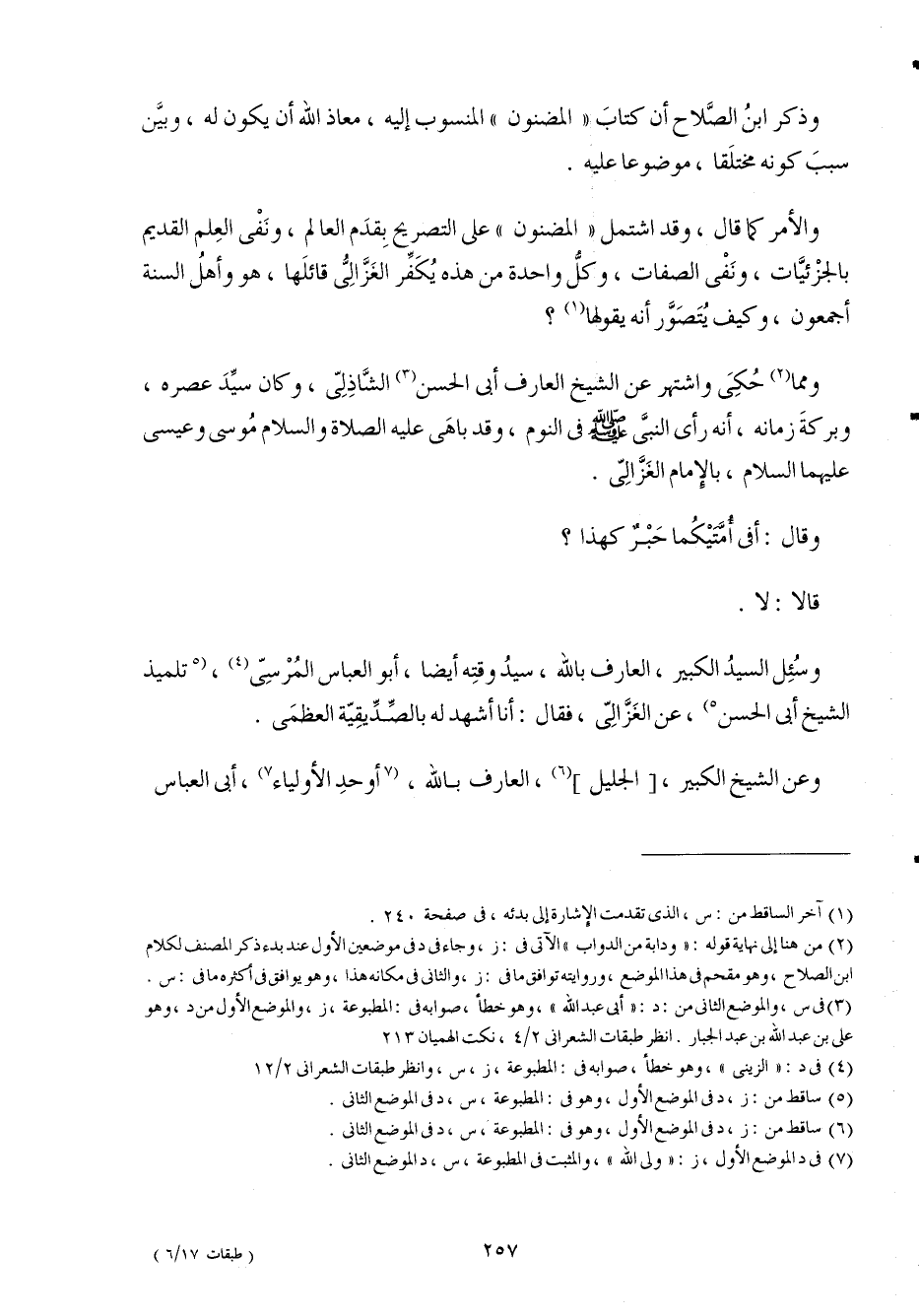 وَمِمَّا حكى واشتهر عَن الشَّيْخ الْعَارِف أبي الْحسن الشاذلي وَكَانَ سيد عصره وبركة زَمَانه أَنه رأى النَّبِي صلى الله عَلَيْهِ وَسلم فِي النّوم وَقد باهى عَلَيْهِ الصَّلَاة وَالسَّلَام مُوسَى وَعِيسَى عَلَيْهِمَا السَّلَام بإلإمام الْغَزالِيّ
