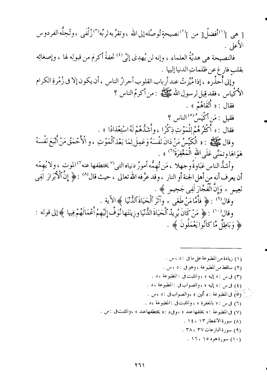 فالنصيحة هِيَ هَدِيَّة الْعلمَاء وَإنَّهُ لن يهدي إِلَى تحفة أكْرم من قبُوله لَهَا وإصغائه بقلب فارغ عَن ظلمات الدُّنْيَا إِلَيْهَا