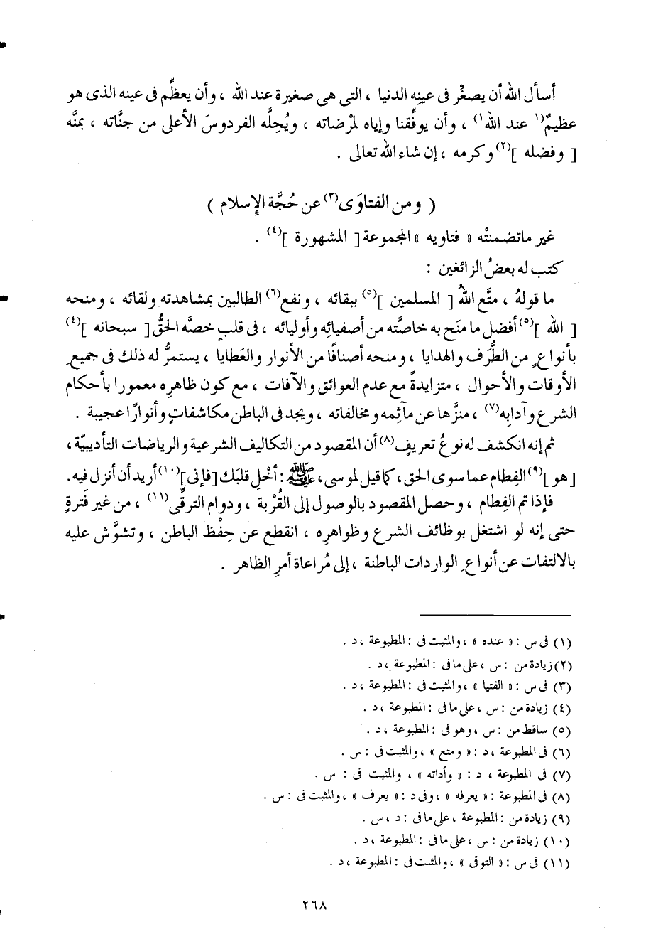 كتب لَهُ بعض الزائغين مَا قَوْله متع الله الْمُسلمين بِبَقَائِهِ ونفع الطالبين بمشاهدته ولقائه ومنحه الله أفضل مَا منح بِهِ خاصته من أصفيائه وأوليائه فِي قلب خصّه الْحق سُبْحَانَهُ بأنواع من الطّرف والهدايا ومنح أصنافا من الْأَنْوَار والعطايا يسْتَمر لَهُ ذَلِك فِي جَمِيع الْأَوْقَات وَالْأَحْوَال متزايدة مَعَ عدم الْعَوَائِق والآفات مَعَ كَون ظَاهِرَة معمورا بِأَحْكَام الشَّرْع وآدابه منزها عَن مآثمه ومخالفاته ويجد فِي الْبَاطِن مكاشفات وأنوارا عَجِيبَة