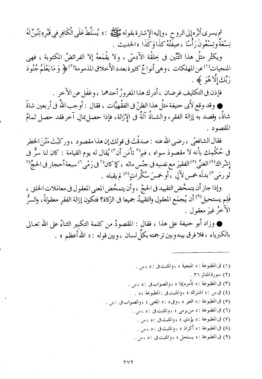 وَقد وَقع لأبي حنيفَة مثل هَذَا الظَّن فِي الفقهيات فَقَالَ أوجب الله فِي أَرْبَعِينَ شَاة شَاة وَقصد بِهِ إِزَالَة الْفقر وَالشَّاة آلَة فِي الْإِزَالَة فَإِذا حصل بِمَال آخر فقد حصل تَمام الْمَقْصُود