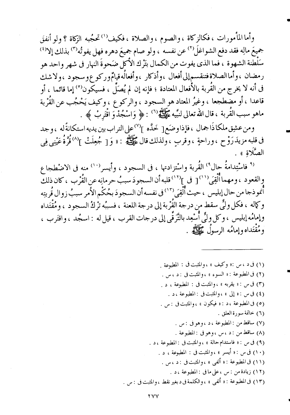 فاستدامه حَال الْقرْبَة واستزادتها فِي السُّجُود وأيسر مِنْهُ فِي الِاضْطِجَاع وَالْقعُود وَمهما ألقِي فِي قلبه أَن السُّجُود سَبَب حرمانه عَن الْقرب كَانَ ذَلِك أنموذجا من حَال إِبْلِيس حَيْثُ ألقِي فِي نَفسه أَن السُّجُود بِحكم الْأَمر سَبَب زَوَال قربته وكماله فَكل ولي سقط من دَرَجَة الْقرْبَة إِلَى دَرَجَة اللَّعْنَة فسببه ترك السُّجُود ومقتداه وإمامه إِبْلِيس وكل ولي أسعد بالترقي إِلَى دَرَجَات الْقرب قيل لَهُ اسجد واقترب ومقتداه وإمامه الرَّسُول صلى الله عَلَيْهِ وَسلم