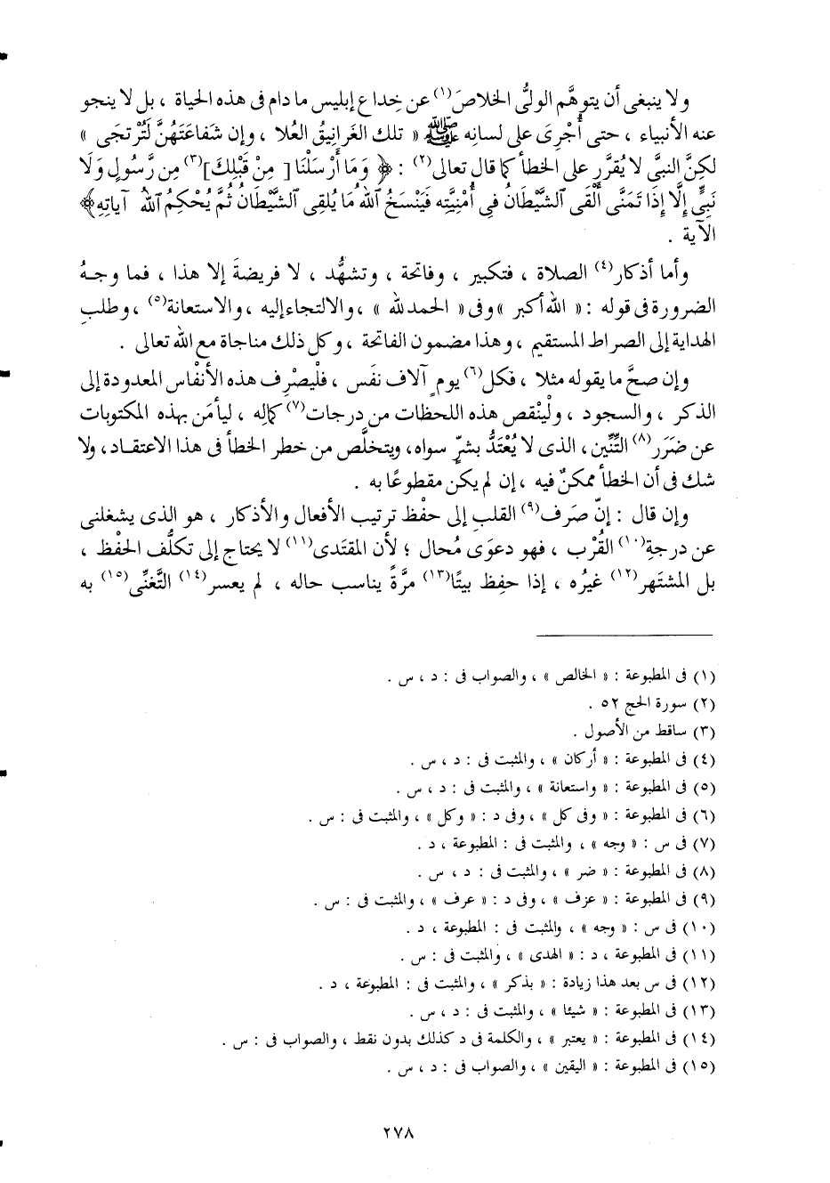 وَلَا يَنْبَغِي أَن يتَوَهَّم الْوَلِيّ الْخَلَاص عَن خداع إِبْلِيس مادام فِي هَذِه الْحَيَاة بل لَا ينجو عَنهُ الْأَنْبِيَاء حَتَّى أجري على لِسَانه صلى الله عَلَيْهِ وَسلم تِلْكَ الغرانيق الْعلَا وَإِن شفاعتهن لترتجى) لَكِن النَّبِي لَا يُقرر على الْخَطَأ كَمَا قَالَ تَعَالَى {وَمَا أرسلنَا من قبلك من رَسُول وَلَا نَبِي إِلَّا إِذا تمنى ألْقى الشَّيْطَان فِي أمْنِيته فَينْسَخ الله مَا يلقِي الشَّيْطَان ثمَّ يحكم الله آيَاته} الْآيَة