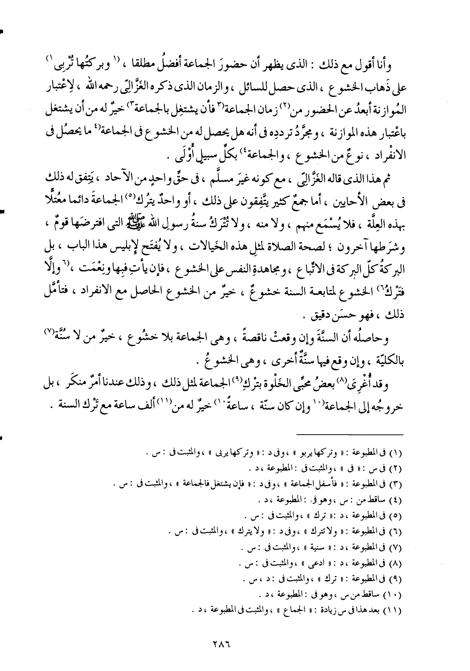 ثمَّ هَذَا الَّذِي قَالَه الْغَزالِيّ مَعَ كَونه غير مُسلم فِي حق وَاحِد من الْآحَاد يتَّفق لَهُ ذَلِك فِي بعض الْأَحَايِين أما جمع كثير يتفقون على ذَلِك أَو وَاحِد يتْرك الْجَمَاعَة دَائِما مُعْتَلًّا بِهَذِهِ الْعلَّة فَلَا يسمع مِنْهُم وَلَا مِنْهُ وَلَا تتْرك سنة رَسُول الله صلى الله عَلَيْهِ وَسلم الَّتِي افترضها قوم وَشَرطهَا آخَرُونَ لصِحَّة الصَّلَاة لمثل هَذِه الخيالات وَلَا يفتح لإبليس هَذَا الْبَاب بل الْبركَة كل الْبركَة فِي الِاتِّبَاع ومجاهدة النَّفس على الْخُشُوع فَإِن يَأْتِ فبها ونعمت وَإِلَّا فَترك الْخُشُوع لمتابعة السّنة خشوع خير من الْخُشُوع الْحَاصِل مَعَ الِانْفِرَاد فَتَأمل ذَلِك فَهُوَ حسن دَقِيق