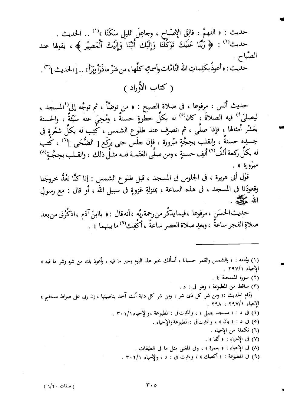 حَدِيث انس مَرْفُوعا فِي صَلَاة الصُّبْح من تَوَضَّأ ثمَّ توجه إِلَى الْمَسْجِد ليُصَلِّي فِيهِ الصَّلَاة كَانَ لَهُ بِكُل خطْوَة حَسَنَة ومحي عَنهُ سَيِّئَة والحسنة بِعشر أَمْثَالهَا فَإِذا صلى ثمَّ انْصَرف عِنْد طُلُوع الشَّمْس كتب لَهُ بِكُل شَعْرَة فِي جسده حَسَنَة وانقلب بِحجَّة مبرورة فَإِن جلس حَتَّى يرْكَع الضُّحَى كتب لَهُ بِكُل رَكْعَة ألف ألف حَسَنَة وَمن صلى الْعَتَمَة فَلهُ مثل ذَلِك وانقلب بِحجَّة مبرورة