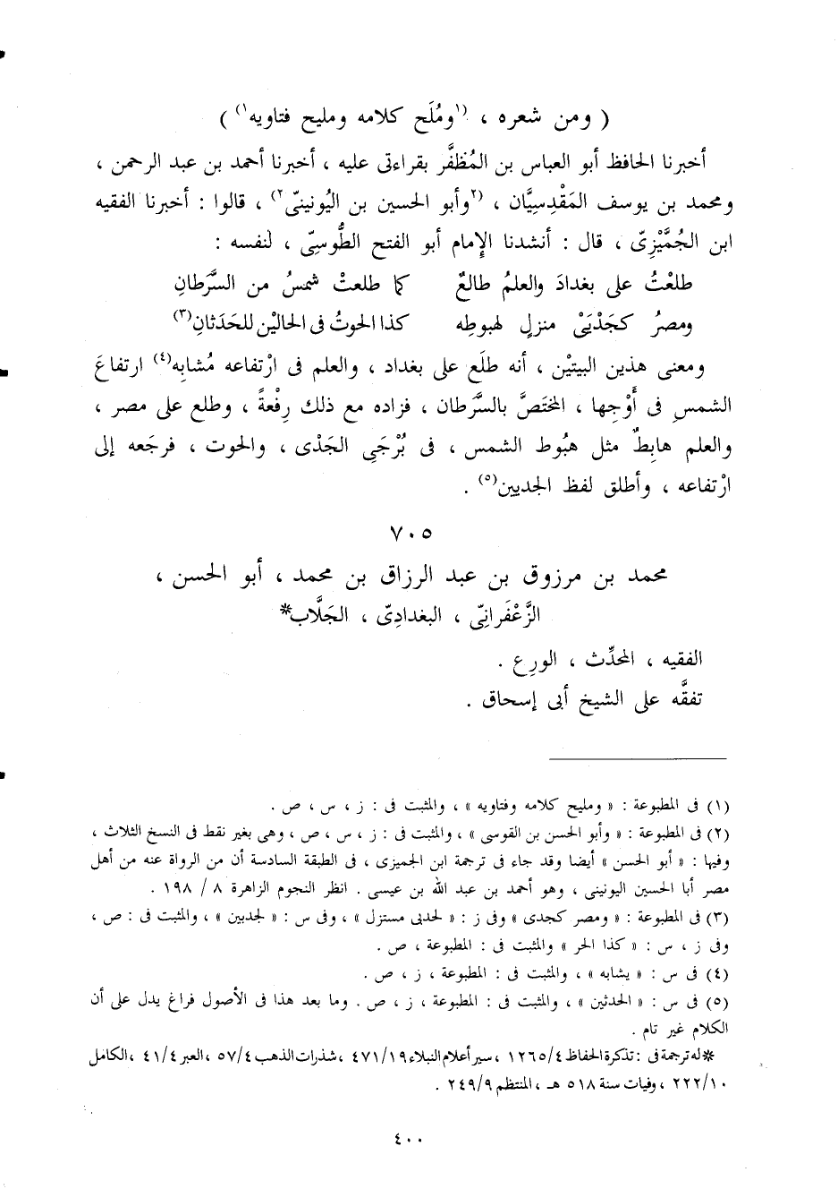 705 - مُحَمَّد بن مَرْزُوق بن عبد الرَّزَّاق بن مُحَمَّد أَبُو الْحسن الزَّعْفَرَانِي الْبَغْدَادِيّ الْجلاب
